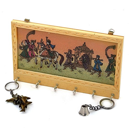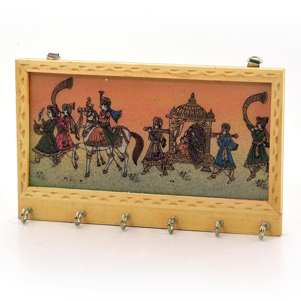 A very unique design of marriage procession made with finely crushed real gemstones on a glass base which is a traditional rajasthani art prepared by the master artisans of jaipur. The beauty of the unique item is the flawless gemstone painting above the key holding hooks and the neatly carved wooden border.