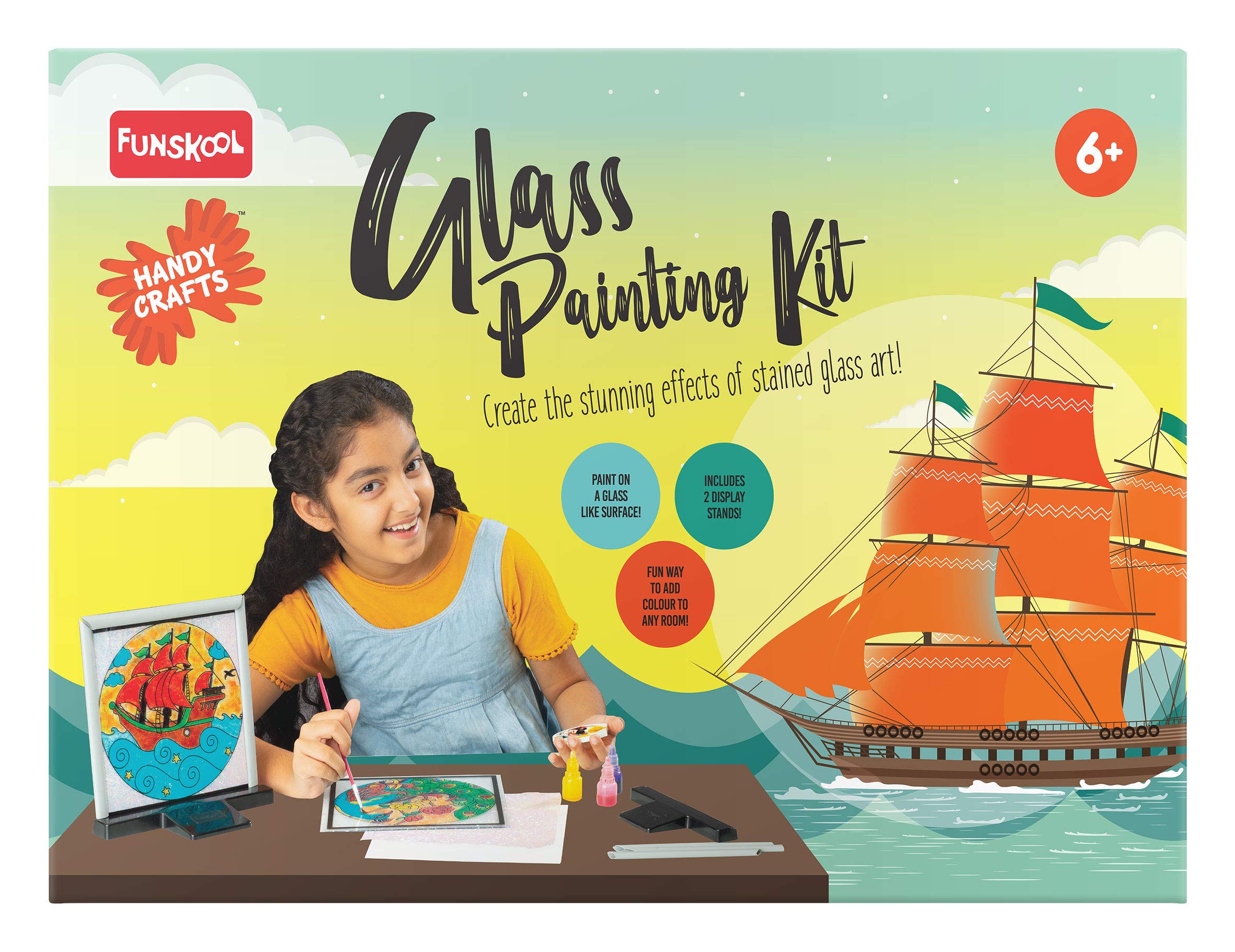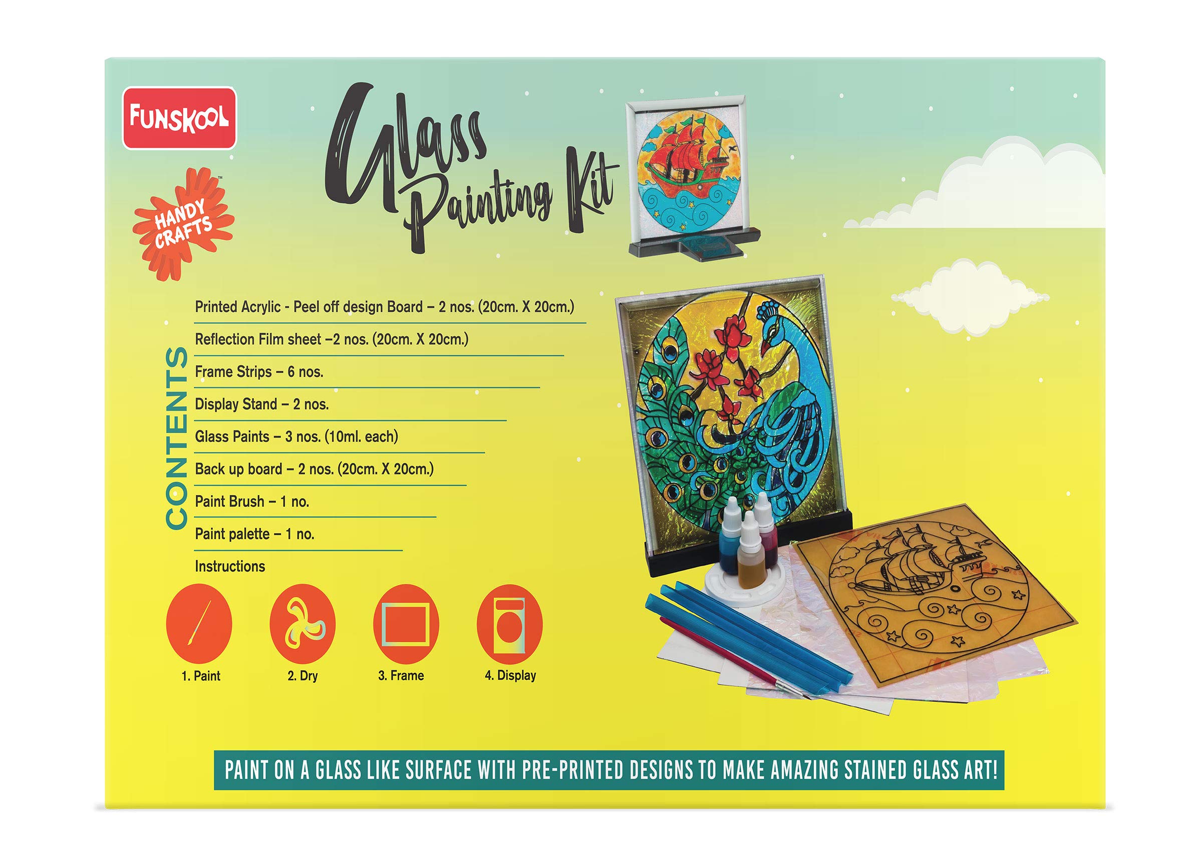 WHAT'S INSIDE THE BOX: The Funskool Glass Painting Kit Comes With 2 printed peel-off acrylic boards (20 x 20 cm) 2 reflection film sheets 2 backup boards 6 frame strips 2 display stands 3 glass paints (10 ml each) 1 paintbrush 1 paint palette and an instr