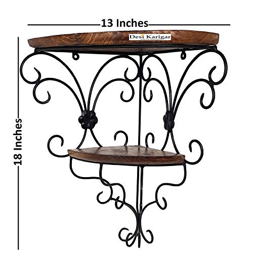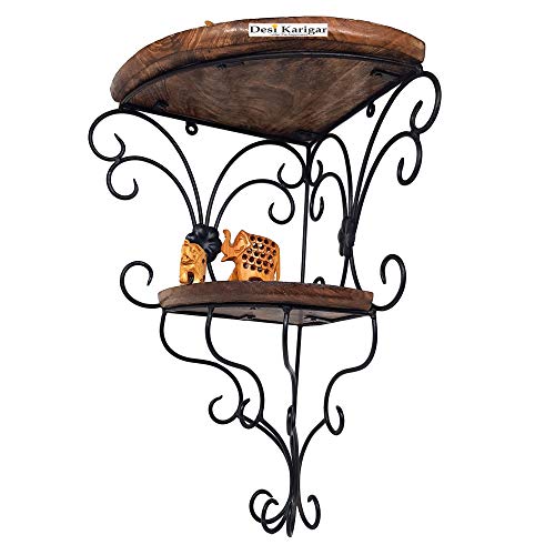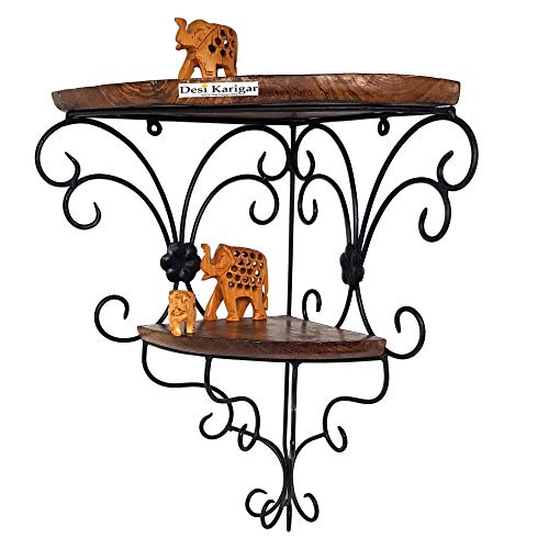 Versatile wall shelf features a nice shape. It can be used to hold decor items collectibles showpieces and more. Wooden & wrought iron rack shelf is made of high quality durable long life solid wood and iron with nice Finish. It adds warmth and character to any room with this beautiful rack shelf design. Its clean simple lines and edge detail complement any home decor. Save your room's space with the rack shelf to show off souveniers small treasures or art. This sturdy shelf can be wall mounted. Use it to hold arts flower pots etc. It can also be hung on the wall to hold decor items. Bring home a fusion of style and beauty with this Wooden & wrought iron rack shelf made by the craftsmen of Desi Karigar Saharanpur. SPECIALITY: · Handmade with pure Wrought Iron and wood with Antique Black and brown finish · Authentic and unique design to decorate your room · Beautiful design with Antique Black Paint which gives it Antique look · Adorned with a unique shape which gives it an indigenous appearance · Best wall bracket design with complex engineering · Strong and durable · Made by rural artisans of Desi Karigar Brand Saharanpur USABILITY: · Can be used for decorating your Room or kids room · Can be used to decorate all walls of your house. · Will give you a variation from regular plastic glass and steel brackets · Will increase your decor value when you place them on your walls · Can be gifted during house warming ceremony birthdays Christmas etc. · Can be gifted to friends relatives etc. This wrought iron wall bracket is hand made and produced out of sustainable wrought iron. This wall bracket serves as a nice showpiece itself. This bracket shelf suits perfectly as decoration of your Room. Each iron bracket is individually branded by the natural grains of the iron and wood and the touch of the craftsman of Desi Karigar.