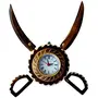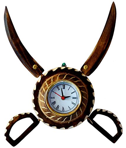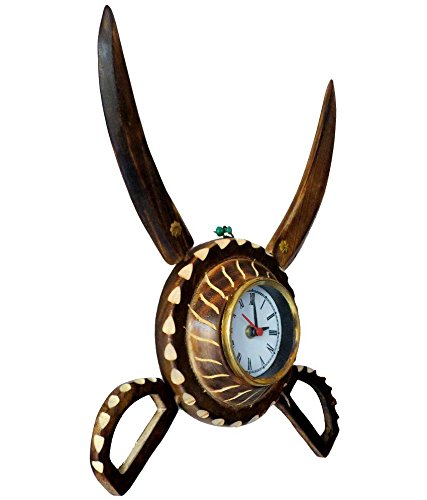 Desi karigar wooden sword armour clock. Decorative wall clock with an antique finish. This handcrafted traditional wooden sword armour design wall clock is made of mango wood. This masterpiece utility item can be used as a show-piece in your drawing room. It is also an ideal gift for your friends and relatives. The gift piece has been prepared by the master artisans of Saharanpur.