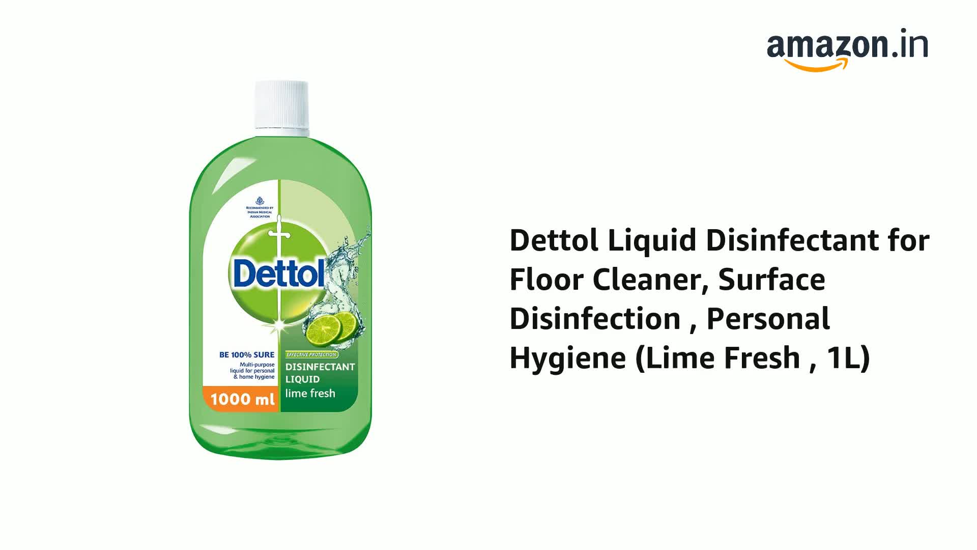 Dettol Disinfectant Multipurpose Liquid cleaner provides protection to you and your family against illness causing germs. This disinfectant liquid sanitizes your home and also helps maintain your personal hygiene. It can be used in bath laundry floor and surface cleaning leaving everything clean and fresh. This multipurpose disinfenctant cleaner for home is recommended by Indian Medical Association. USAGE: Recommended dilutions to protect your family from germs: Bathing - 1 capful to a bucket of water (10 litres); Kitchen Slab - 1 capful to a litre of water; Shaving - 1 capful to a litre of water; Floor Cleaning - 1 capful to a litre of water; Laundry - 1 capful to a litre of water in the last rinse; Refrigerator - 1 capful to a litre of water. If swallowed seek immediate medical advise.