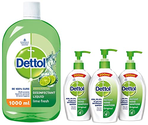 Dettol Liquid Disinfectant for Floor Cleaner Surface Disinfection Personal Hygiene (Lime Fresh 1L)Dettol Disinfectant Multipurpose Liquid cleaner provides protection to you and your family against illness causing germs. This disinfectant liquid sanitizes your home and also helps maintain your personal hygiene. It can be used in bath laundry floor and surface cleaning leaving everything clean and fresh. This multipurpose disinfenctant cleaner for home is recommended by Indian Medical Association. USAGE: Recommended dilutions to protect your family from germs: Bathing - 1 capful to a bucket of water (10 litres); Kitchen Slab - 1 capful to a litre of water; Shaving - 1 capful to a litre of water; Floor Cleaning - 1 capful to a litre of water; Laundry - 1 capful to a litre of water in the last rinse; Refrigerator - 1 capful to a litre of water. If swallowed seek immediate medical advise.Dettol Original Germ Protection Alcohol based Hand Sanitizer Pump 200ml (Pack of 3)DETTOL Hand Sanitizer is protection on the go; whether you are using a public toilet public transport or simply eating outside use DETTOL Sanitizer that offers water-less protection against germs. DETTOL hand sanitizer is specially formulated to protect you from 100 illness causing germs withot the use of soap and water. This rinse free and non-sticky sanitizer is recommended by Indian Medical Association. USAGE: Squirt a thumbnail amount onto the palms. Spread sanitizer and rub palms together. Rub tips of each hand with palm of other hand. Rub hands together until they are dry.