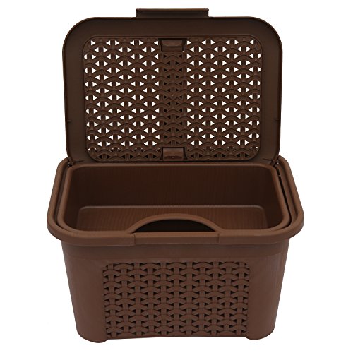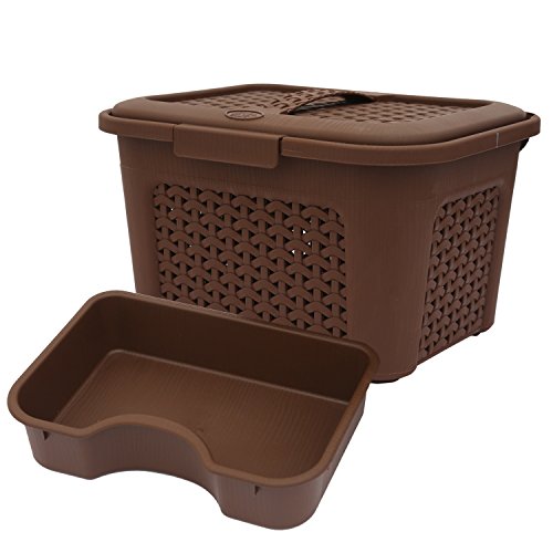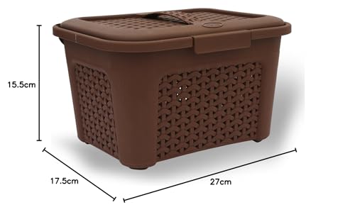 Karma basket is a multi utility basket comes with lockable lid handle and horizontal removable tray inside the basket to keep stuff separated can be used for going temple with all Pooja stuff together tool kit carry items on journey new born babies item kit ideal usage is for storing and carrying items like tools art and craft stationery medicines cosmetic new born babies items kitchen aids and other stuffs. Stored items remains dust free with the help of closing lid and knit design provides ventilation to prevent bad odour. Has handle feature which makes it convenient to hold and carry items also comes with one sided lock to make the items secure while carrying them.