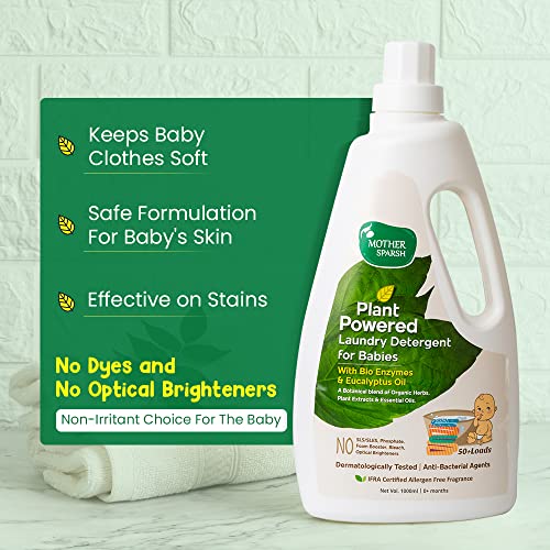 • POWERED BY PLANTS: A baby's skin is sensitive after birth. Their skin has a thin barrier prone to skin irritation and allergies. Mother Sparsh Laundry Detergent for babies is curated with plant-derived ingredients like Aloe Vera extract Eucalyptus Oil & n