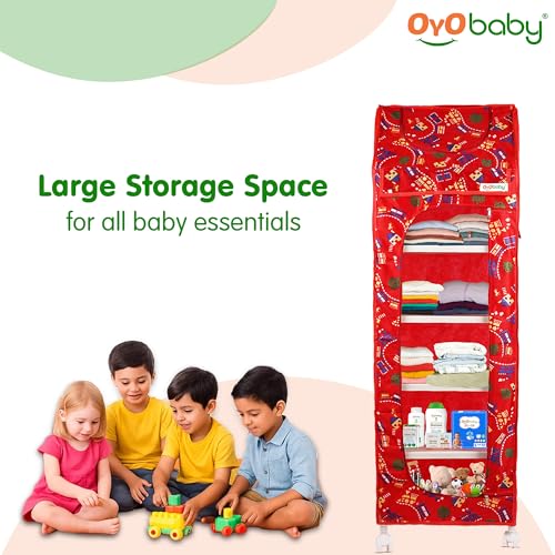 OYO BABY Kids Wardrobe for Storage 6 Shelves | Heavy Duty Plastic Almirah for Baby Clothes, Toys & Books Rack | Compact Storage Organizer for Nursery/Bedroom [Printed - Red]