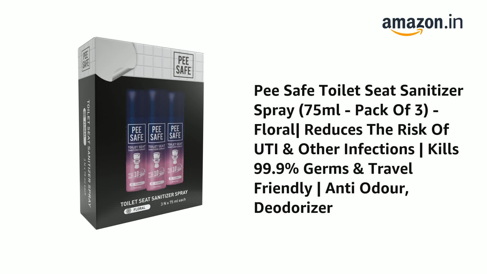 Pee Safe Toilet Seat Sanitizer Spray protects you from germs found in public toilets and s your of contracting infections like UTI. The spray kills 99.9% of germs that are present on the toilet seat's surface. All you've got to spray it from a distance of 25cms and wait for 10 seconds for the spray to work its charm and evaporate.