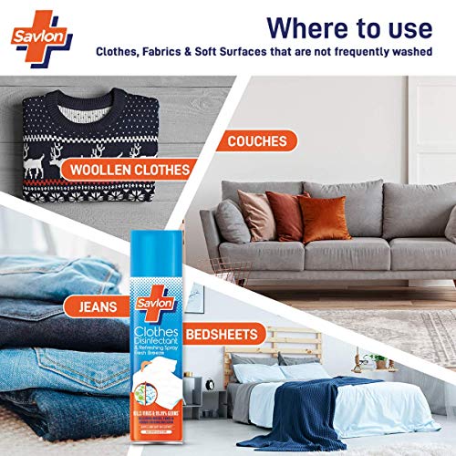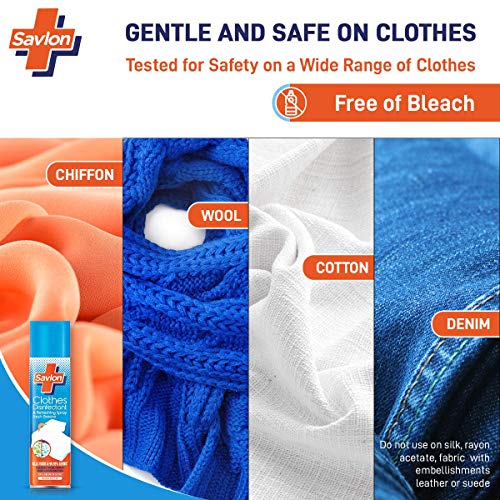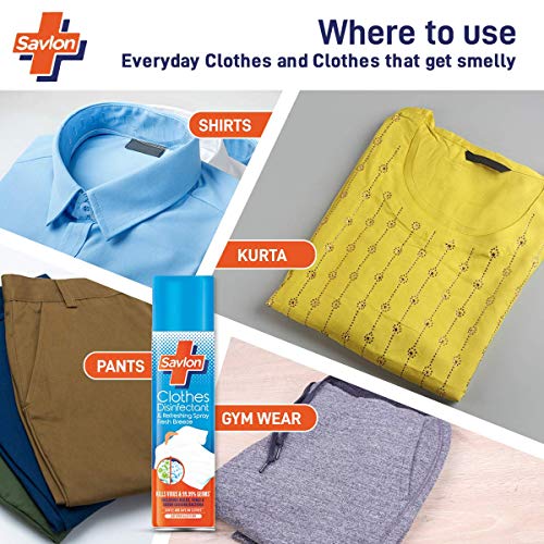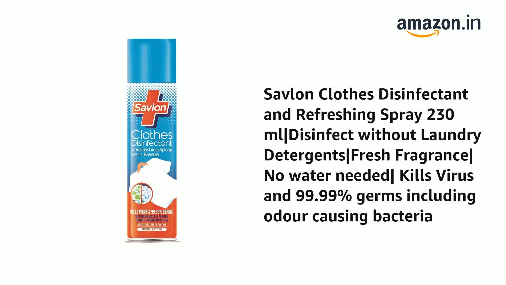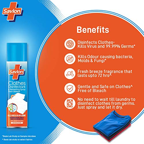 Savlon Clothes Disinfectant and Refreshing Spray kills virus & 99.9% germs like molds fungi and odour causing bacteria on your clothes and refreshes them. The specially designed formula is free of bleach gentle and safe on clothes. It also leaves clothes smelling fresh upto 72 hrs. Basis Lab study on sample microbes. Basis lab study on select fabrics.