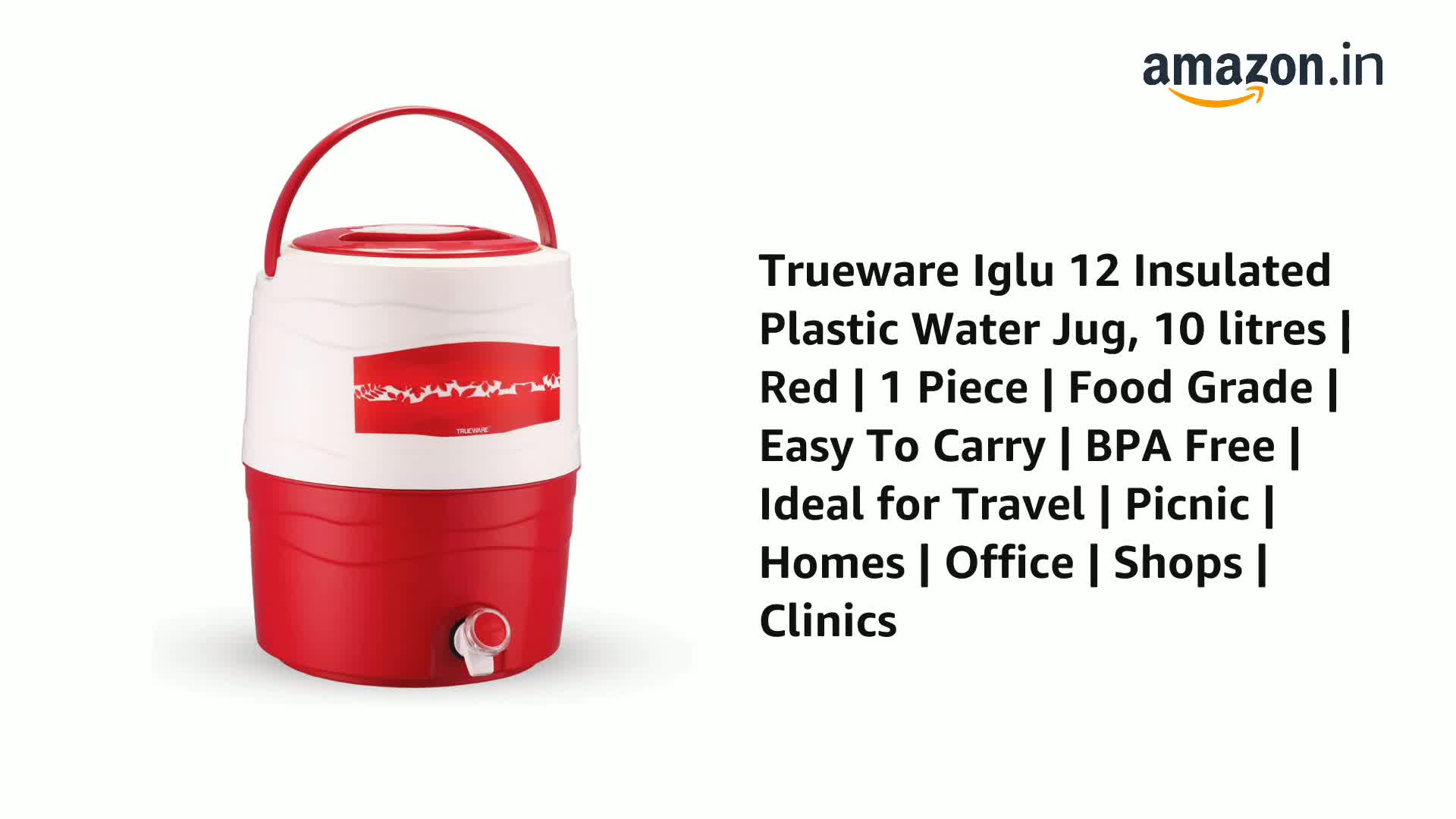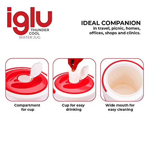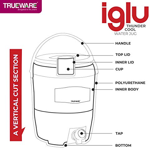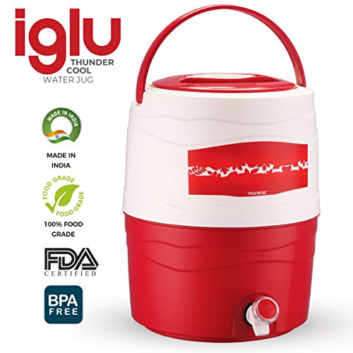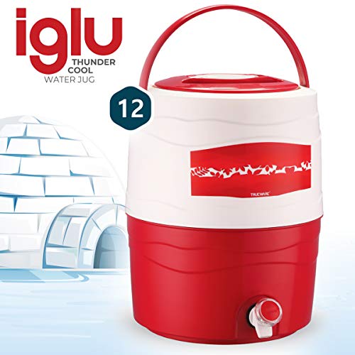 Trueware Iglu 12 Insulated Plastic Water Jug, 10 litres | Red | 1 Piece | Food Grade | Easy To Carry | BPA Free | Ideal for Travel | Picnic | Homes | Office | Shops | Clinics