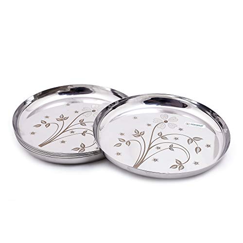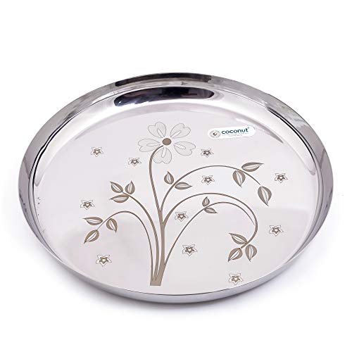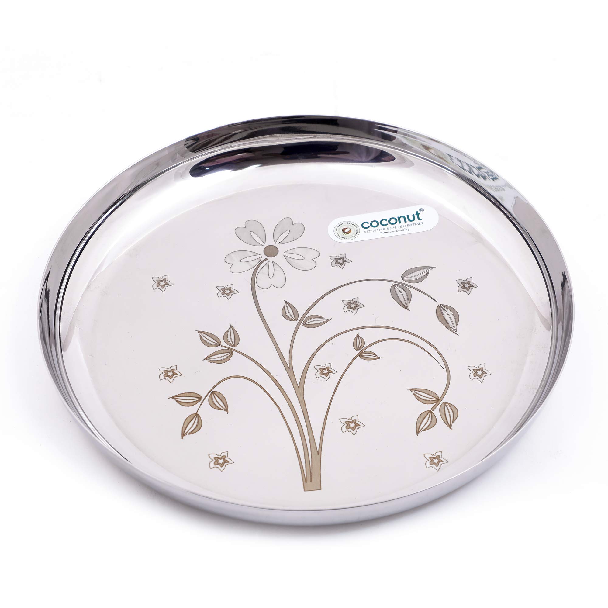 Coconut is a range of Innovative and Quality products for Home and Kitchen Utilities.This P14 Laser Apple Full Plates/Dinner Plates is made from 100% Stainless Steel material. It has a Elegant Floral Laser Design and with the mirror finish the product looks premium shining in Silver color. This comes with Set of 6 Steel Thali Plates. Dinner Plates which is Easy to clean and wash. Made from Heavy Guage High Durable and Long losting product. It is ideally used for Serving Lunch Dinner Snacks and other Food items at the dining table. Product content: SS P14 Laser Apple 9 - Set of 6 Full Dinner Plates.