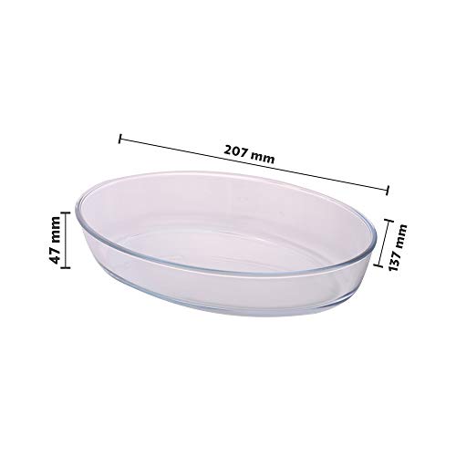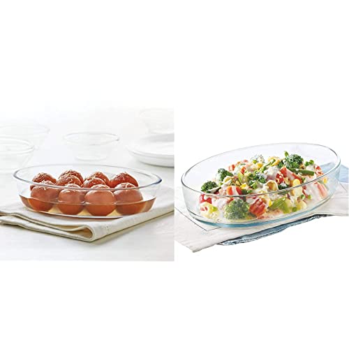 Borosil - Oval Baking Dish 700 ml TransparentThe oval dish is perfect for baked dishes lasagnas raviolis au gratins pulaos sabzis and items such as rasmalais rasgullas gulabjamuns and dahibadas which are best spread out flat. Usage & Care: Do's & Dont's - Can be used in a microwave or electric oven. Not for use over direct flame pre-heat convection oven before use for best results do not put the hot dish on a cold or wet surface allow the hot dish to cool slightly before adding any cold liquid to the food allow dishes with very hot food to reach room temperature before putting it into the fridge/freezer do not use abrasive cleaners to ensure that glass stays scratch-free do not use plastic lids in the microwave.Borosil - Oval Baking Dish 2.2 litres TransparentThe oval dish is perfect for baked dishes lasagnas raviolis au gratins pulaos sabzis and items such as rasmalais rasgullas gulabjamuns and dahibadas which are best spread out flat.