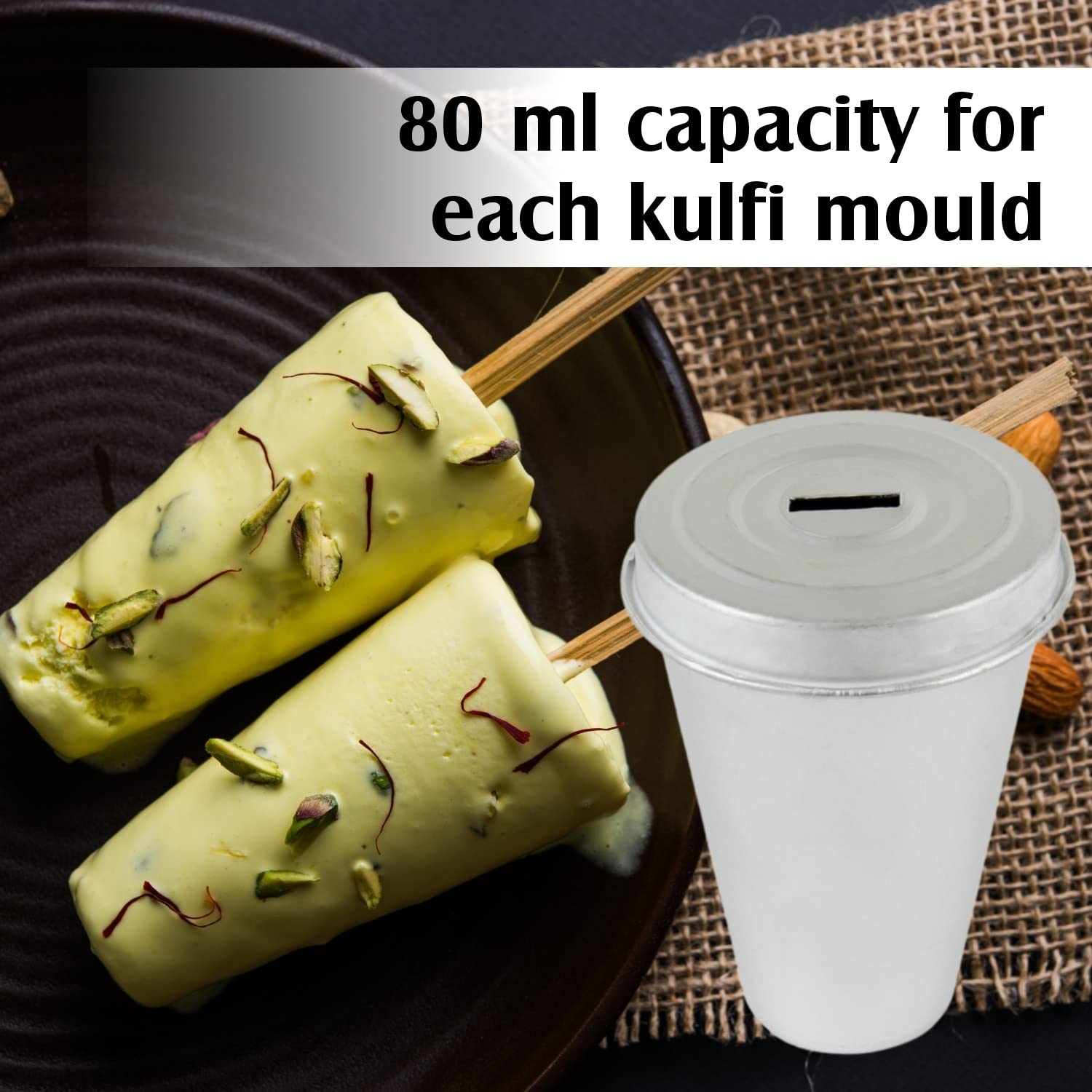Prepare delicious and hygienic frozen treats at home with this Aluminium Reusable Kulfi Cone Mould Set of 6 with Stand & Ice Cream Stick DIY Kit. Crafted from high-quality food-grade aluminium these moulds ensure excellent durability resistance to rust and safe reuse for countless dessert-making sessions. The set includes 6 individual cone-shaped moulds a stable stand to keep them upright in the freezer and ice cream sticks offering everything you need to make traditional kulfis ice lollies popsicles and more. With an easy-release design and smooth inner surface your kulfis or ice creams pop out perfectly shaped without sticking or breaking. The compact size of each mould (7 x 5 x 2.5 cm) allows for convenient storage and effortless handling. Whether it's a summer family gathering kids' party or a personal dessert craving this DIY kit is the perfect companion for crafting refreshing frozen delights in your kitchen. Create endless flavor combinations and enjoy homemade frozen treats made fresh and just the way you like!