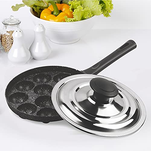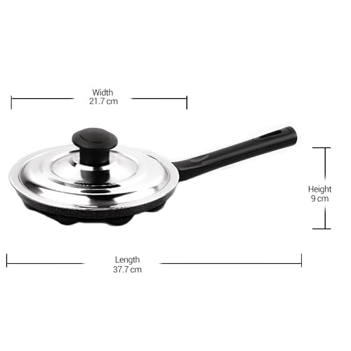 Pattern:12 PITThe appam patra comes Uniquely designed for special dishes like Appams Paniyarams Kuzhi Panniarrams Puddus Gunta Ponganalu Neyyappam and other batter based delicacies. The Appam Patra comes with 5 layer food-grade non-stick coating which enhances both durability and cooking performance. The non-stick coating help in cooking with minimum oil or butter. As the food does not stick to the surface and can be easily scooped off. So it ensures hassle-free healthy cooking without spoiling the taste of the food. It comes with Bakelite handle that helps you lift the hot pan without the use of mittens or a cloth. Bakelite is poor conductor of heat so would not burn even when exposed to high heat.