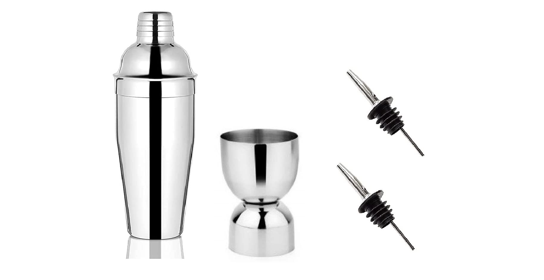 Delux Cocktail Shaker- IDEAL FOR ANY LEVEL - If you're looking to mix up delicious and refreshing cocktails that you'll want to serve again and again at your next cocktail party, then this is the set you'll need. It's durable, rugged, washable and great to train the beginner bartender, as well as to be enjoyed by the pro's. Recommended for anyone who wants to start a home bar, or add class and variety to an existing one, Capacity- 750 ml, Wine Pourer- 2- Tapered Liquor Pourer Spout features a natural cork stopper to ensuring a secure fit, Liquor Pourer with Cork Stopper is perfect for liquor bottles with wider diameter necks like Patron tequila bottles, Steel Damru- Get the right measure each time without breaking into a sweat. A resourceful addition to any bar or Restobar, 30/60 ml