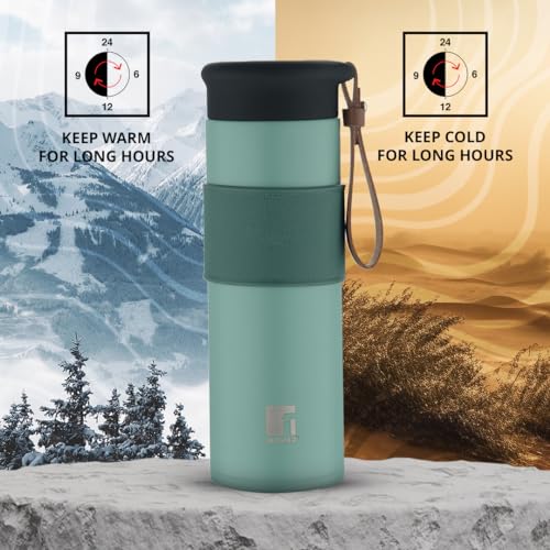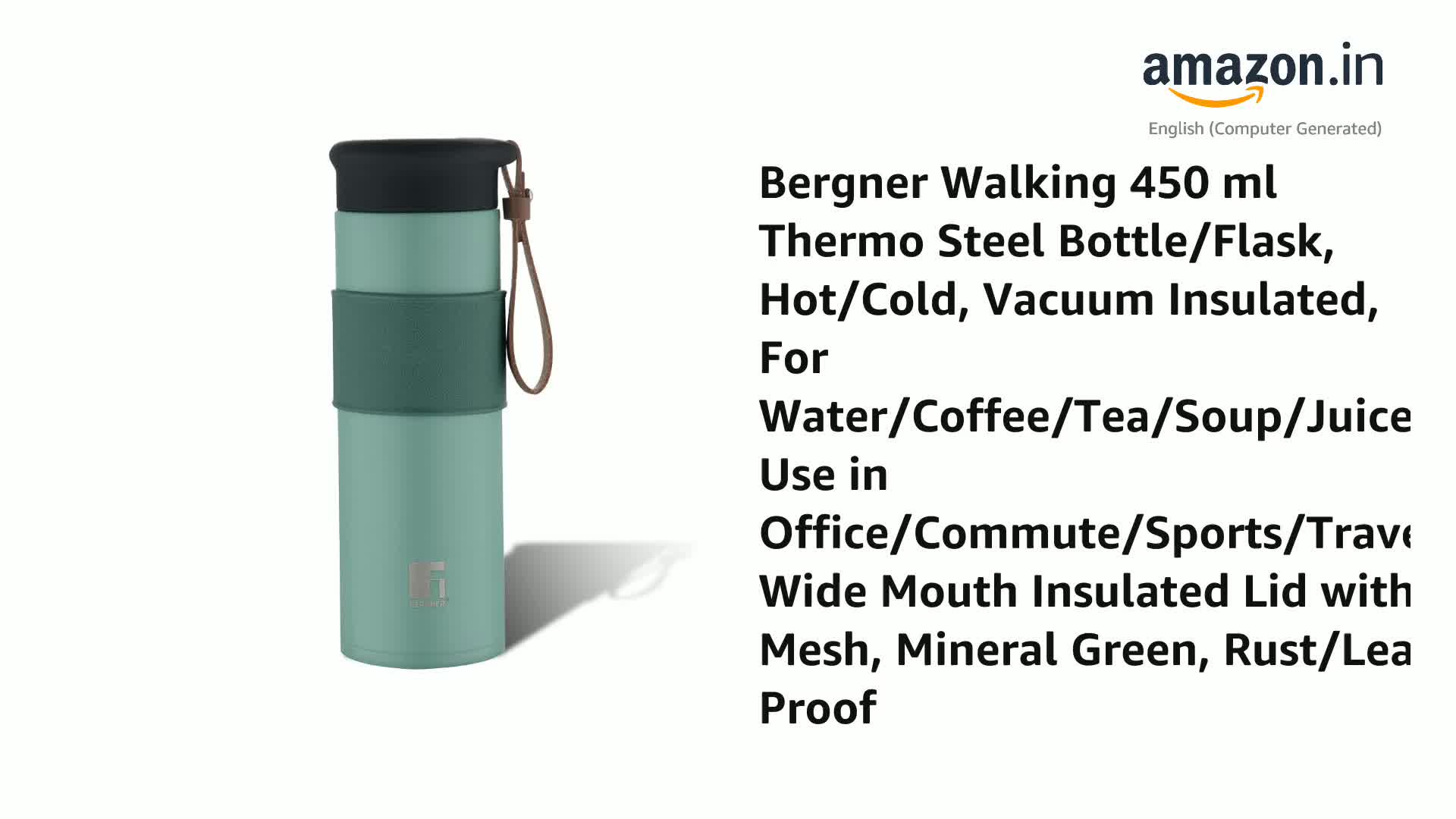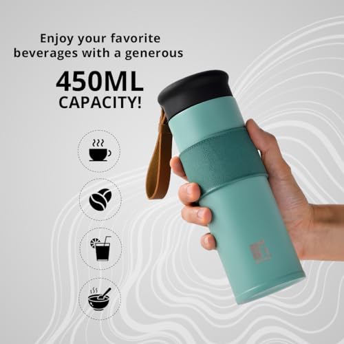 HomeKitchenContainersBottlesBergner Walking 450 ml Thermo Steel Bottle/Flask, Hot/Cold, Vacuum Insulated, For Water/Coffee/Tea/Soup/Juice, Use in Office/Commute/Sports/Travel, Wide Mouth Insulated Lid with Mesh, Mineral Green, Rust/Leak Proof