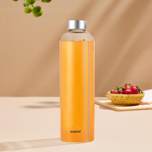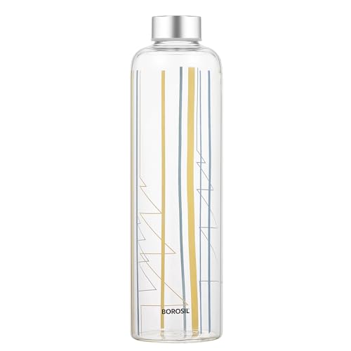 HomeKitchenContainersBottlesBorosil 1 L Artisan Sintra Water Bottle with Steel Lid | Borosilicate Glass Narrow Mouth Bottle for Fridge | Extreme Temperature Resistant For Hot & Cold Water, Milk, Lassi, Juice | Transparent