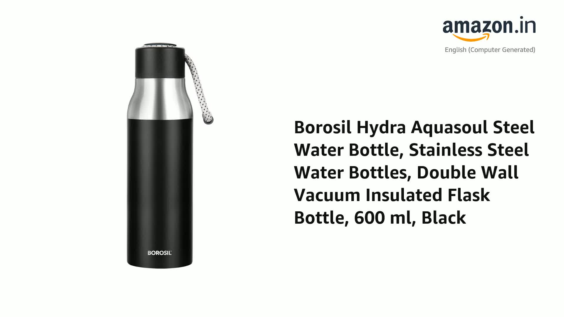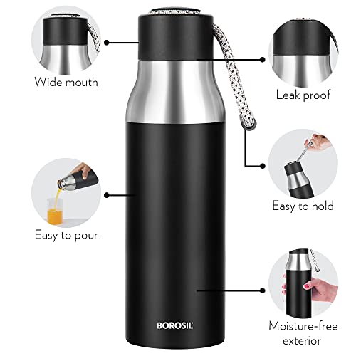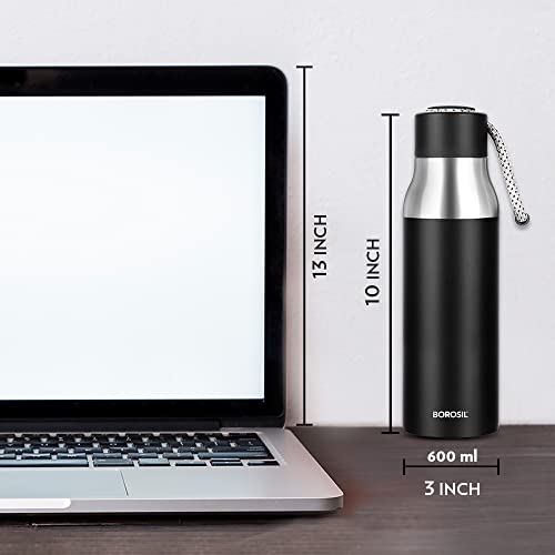 Borosil Hydra Aquasoul Black 600 ml Stainless Steel Water Bottle | Double Wall Vacuum Insulated Flask, Leakproof, Wide Mouth with Strap | 12 Hours Hot & Cold | 1 Year Warranty