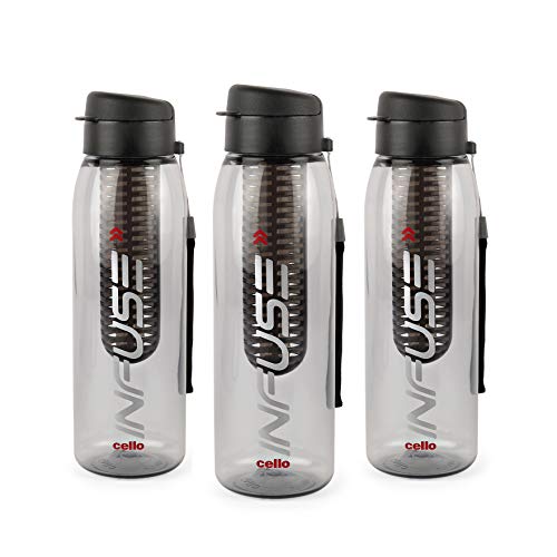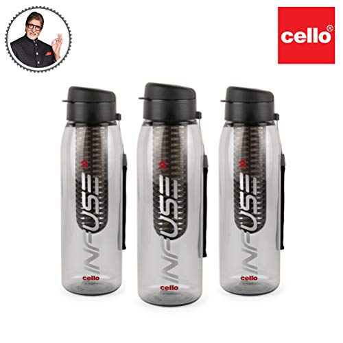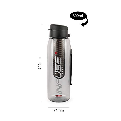 CELLO Infuse Plastic Water Bottle, 800 ml, Set of 3, Black | Detox Bottle with Infuser Chamber | Leakproof Plastic Bottle with Wide Mouth Opening | Ideal for Gym, Office, Travel