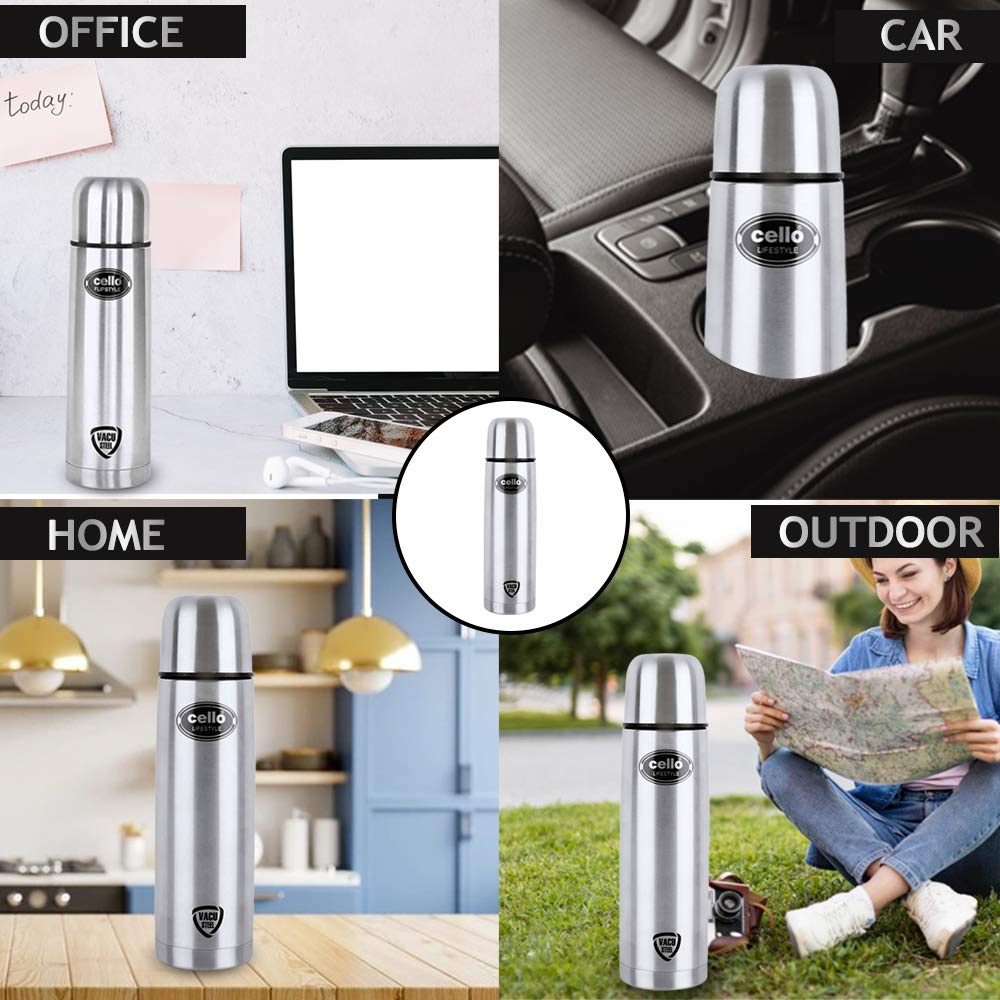 Cello Lifestyle Vacuum Insulated Flask with Thermal Jacket 750 ml | Hot and Cold Water Bottle with Push-down Lid | Double Walled Stainless Steel Bottle for Travel Home Office School | Steel Thermos