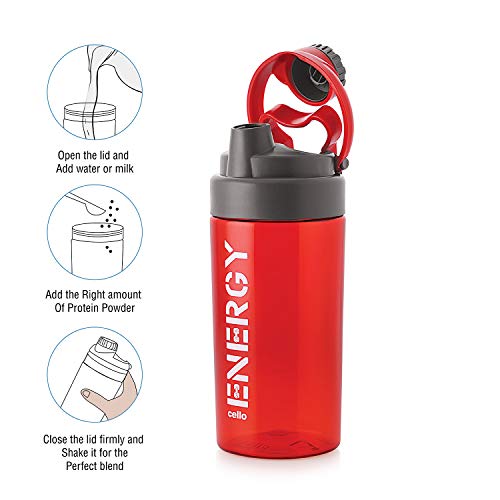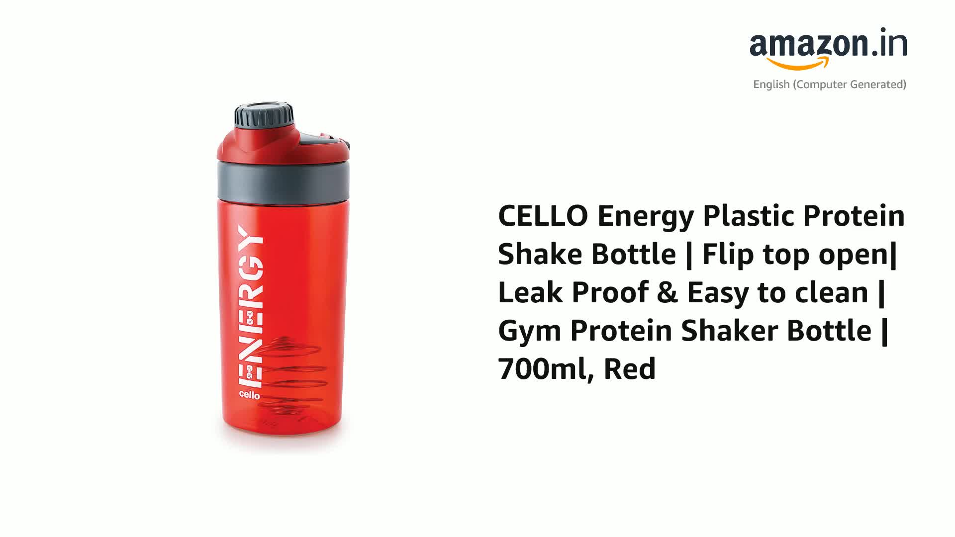 CELLO Energy Plastic Protein Shake Bottle | Flip top open| Leak Proof & Easy to clean | Gym Protein Shaker Bottle | 700ml, Red