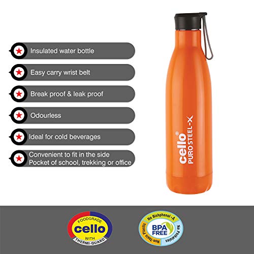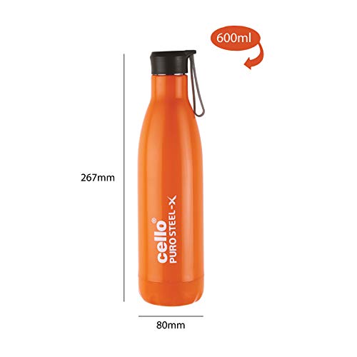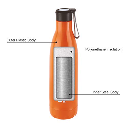 CELLO Puro Steel-X Rover 600 | Water Bottle with Inner Steel and Outer Plastic | Leak Proof Insulated Water Bottle | Suitable for Home, School, Office, Outdoor | 480ml, Orange