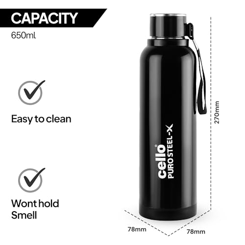 CELLO Puro Steel-X Benz 900 | Leak Proof | Wide Mouth & Easy to Open | Insulated Inner Steel Water Bottle | Cold Insulation only | 730ml Capacity | Black
