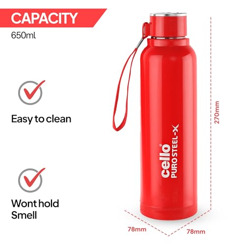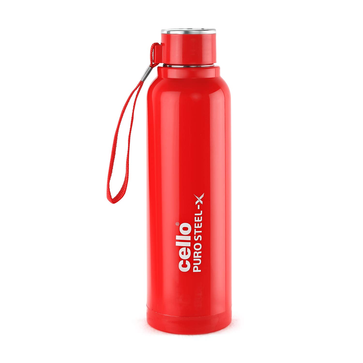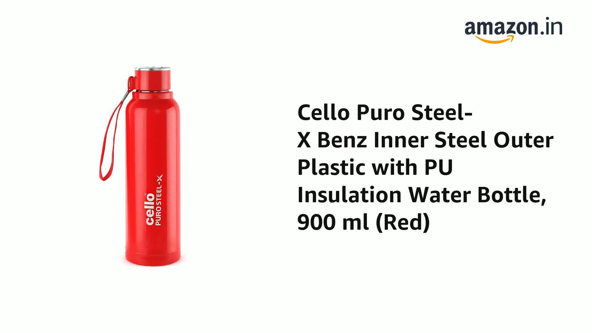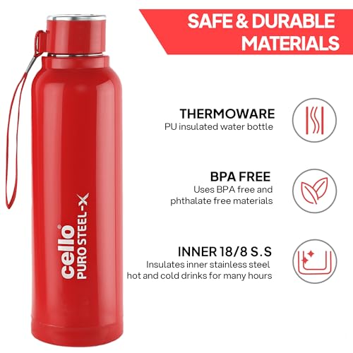 CELLO Puro Steel-X Benz 900 | Leak Proof| Wide Mouth & Easy to Open | Insulated Inner Steel Water Bottle | 730ml | Red