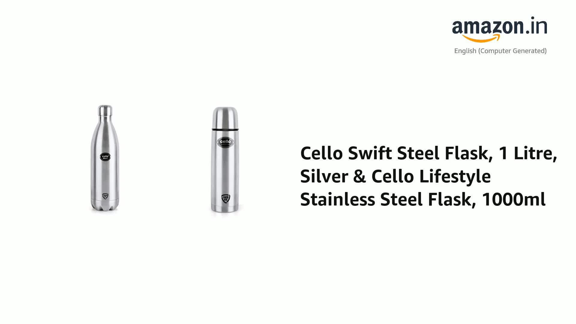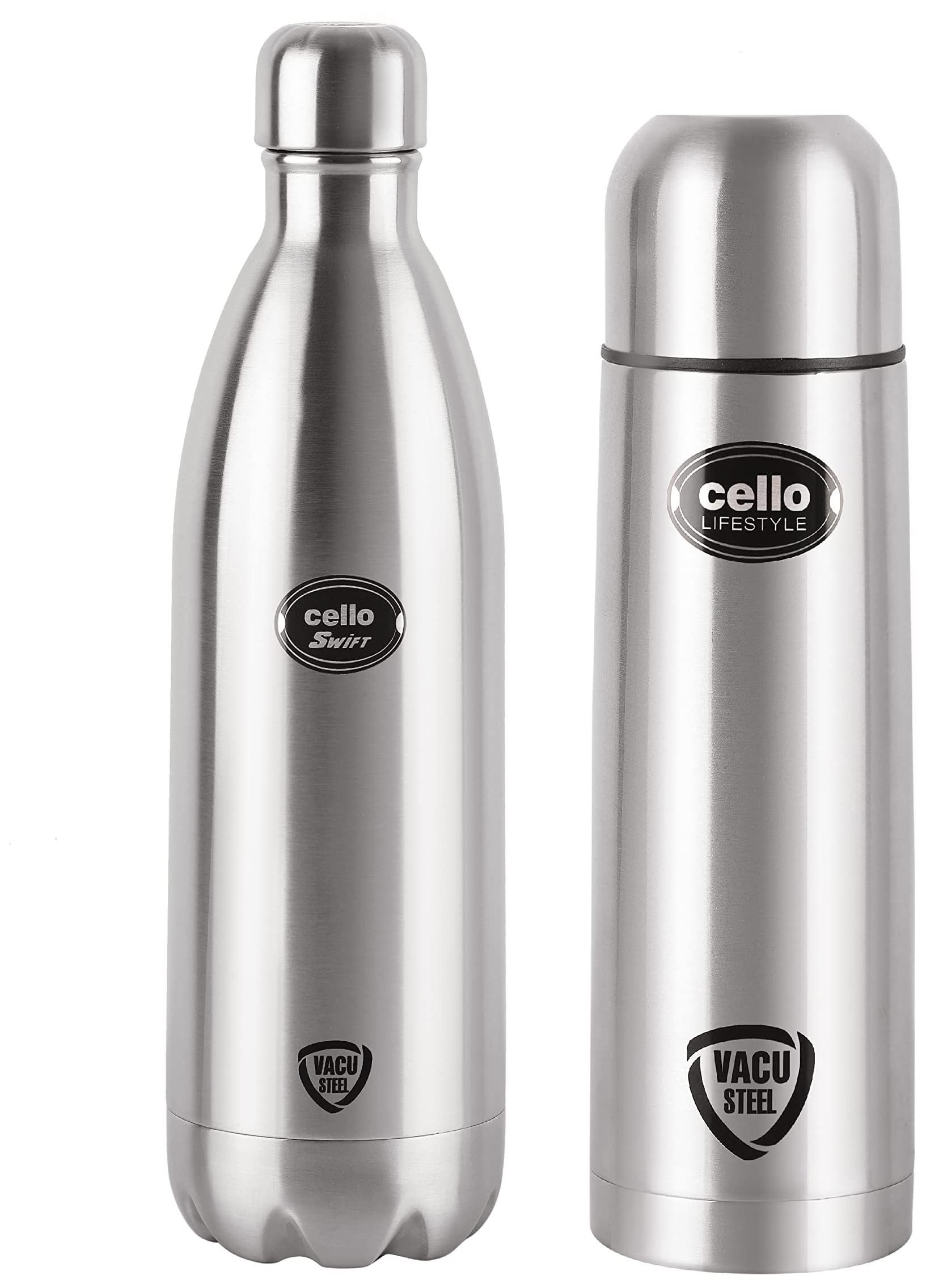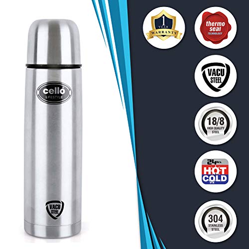 Cello Swift Steel Flask 1 Litre SilverWith this water bottle from the house of Cello you can carry chilled water or your favorite beverage. Made using steel for durability this bottle has an air-tight plastic cap.Cello Lifestyle Stainless Steel Flask 1000mlCarry tea or coffee to office in this bullet vacuum flask and ensure it stays warm for a long period of time. This bullet vacuum flask is carefully made from fine-quality stainless steel plastic and rubber which make it a worthy investment for sure.