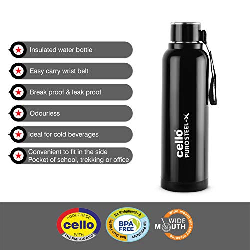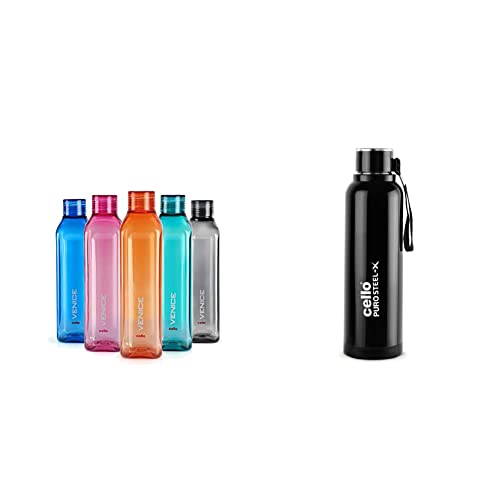 Cello Venice Plastic Bottle Set 1 Litre Set of 5 AssortedManufactured with 100 percent food grade virgin/non toxic plastic this bottle set by Cello is BPA-free ensuring a healthier lifestyle. These crystal clear bottles are spill proof and easy to pour. Not only are these bottles leak-proof it is also unbreakable and extremely durable. Cello makes these bottles to be freezer and refrigerator safe. These reusable bottles come in various colours giving it a vibrant edge over other bottles. Ergonomically designed these lightweight and compact bottles are very useful for your everyday need.Cello Puro Steel-X Benz Inner Steel Outer Plastic with PU Insulation Water Bottle 900 ml (Black)For over two decades cello has been continuously evolving anticipating consumer needs to manufacture range of hygienic products to help preserve health if your loved ones. Cello has an unmatched range of insulated thermo ware products with world classic designs made from German polyurethane foam manufactured at their ultra-modern plant in daman and haridwar. Its range includes water jugs water bottles lunch carrier casseroles jugs flasks and more to keep food hot and tasty or to enjoy a hot or cold beverage. After intensive research cello has developed unique breakthrough product “ thermi guard” is an innovative polyurethane protective shields which gives cello’s thermoware range superior performance year after year. No wonder millions of families in India and around the world have put their trust in cello After all wherever there is love wherever there is joy there’s cello a companion of your life.