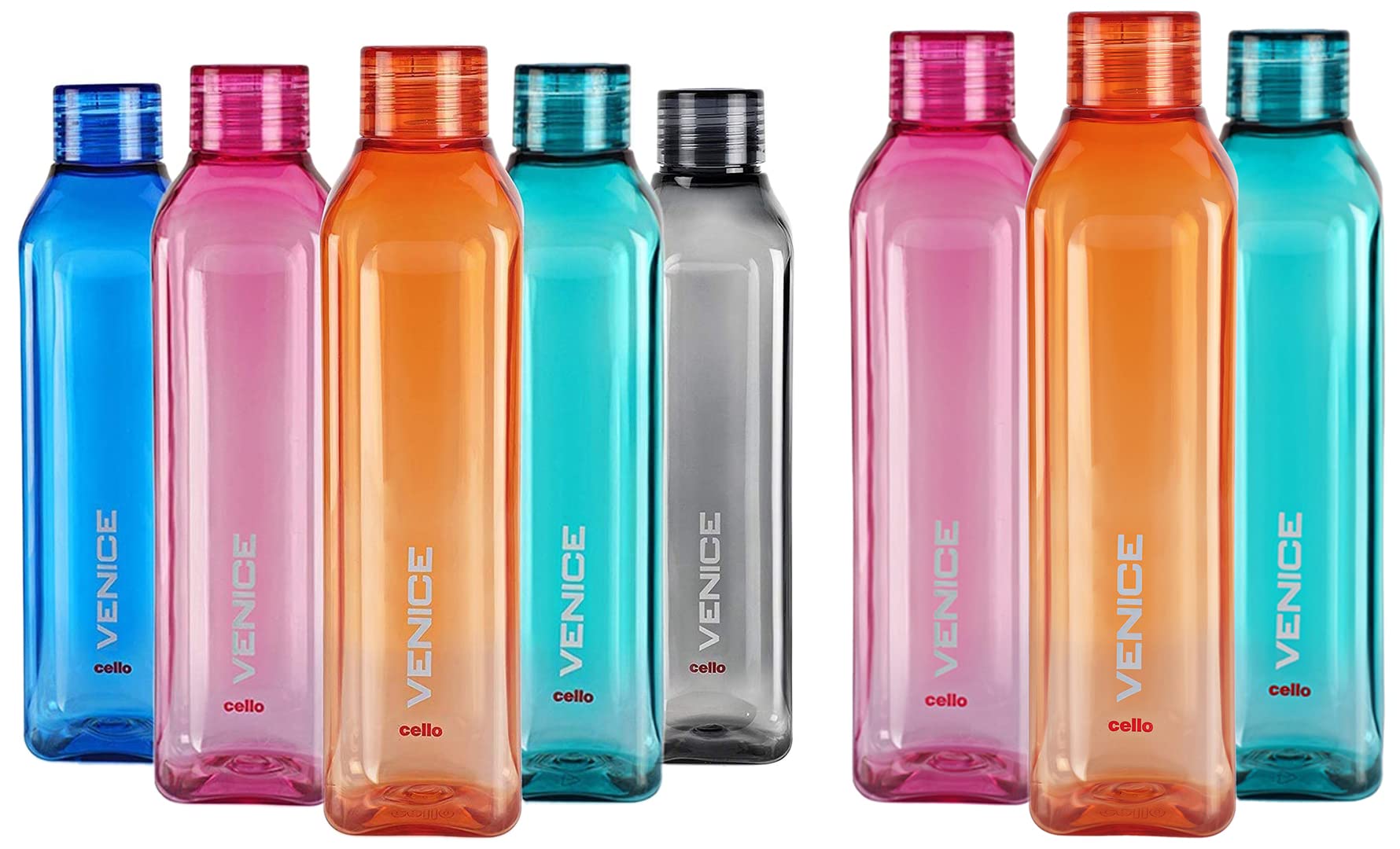 Cello Venice Plastic Bottle Set, 1 Litre, Set of 5, Assorted & Venice Plastic Water Bottle Set, 1 Litre, Set of 3, Assorted Combo