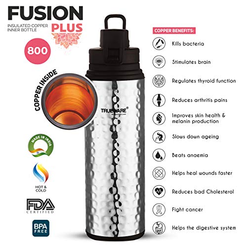 Trueware Copper Fusion 800 Insulated Inner Stainless Steel Water Bottle, 600 ml, Stainless steel finish| Inside Copper | Leak Proof | BPA Free | Hot or Cold for Hours | Office | Gym | Hiking | Treking | Travel Bottle |Hammered Finish
