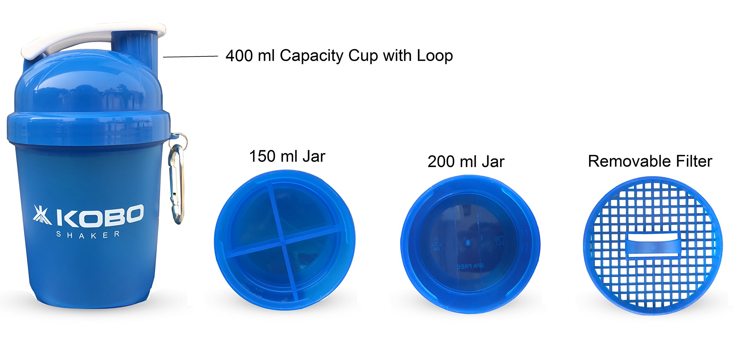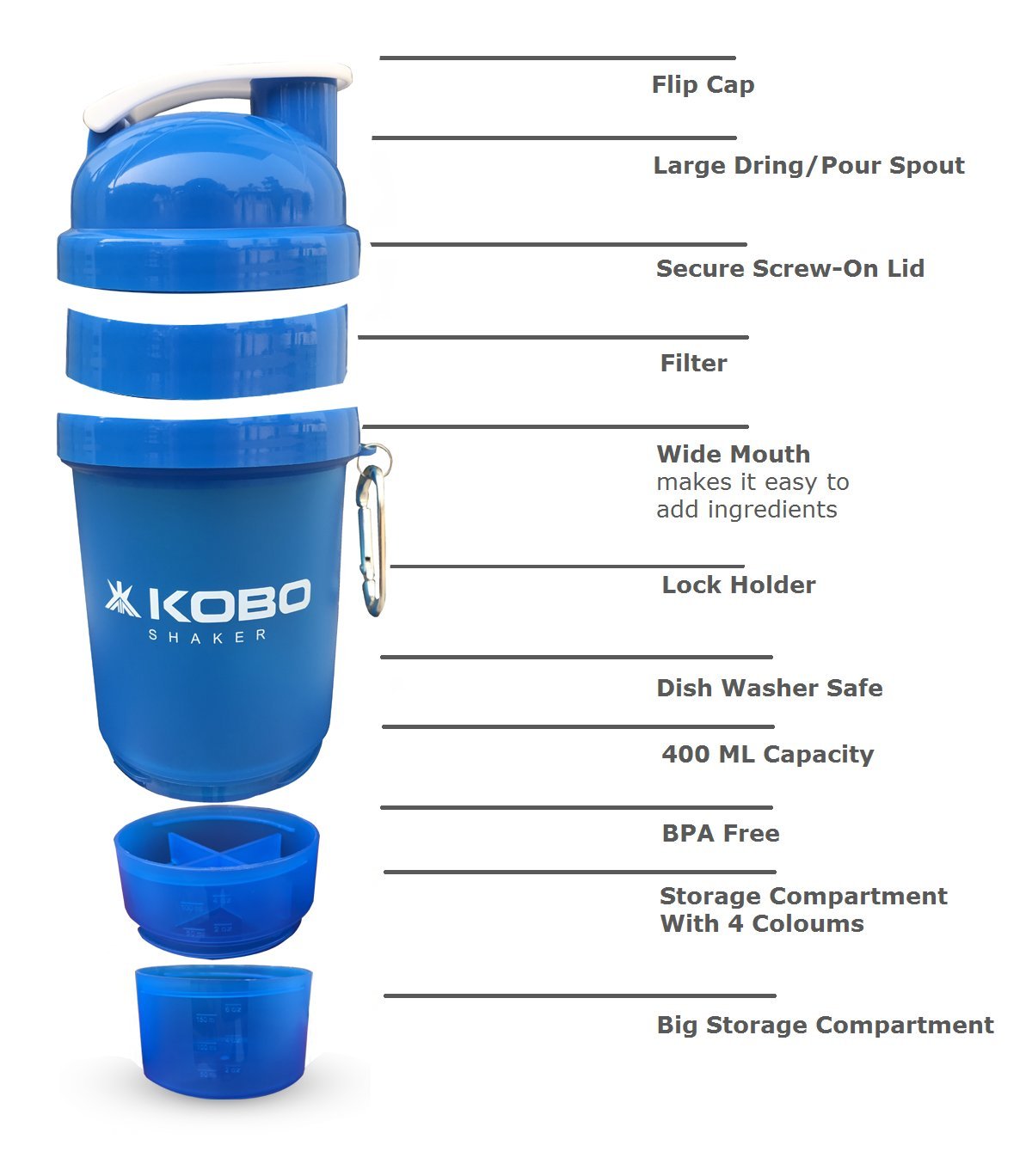 Kobo premium shaker bottle lets you take a quick drink while you run workout or in the middle of the game or while driving in heavy traffic. Made from quality durable ldpe-low density polyethylene toxin free food grade plastic that can hold up to tough conditions. The shaker has 2 compartment. One You can use to store nuts and dry fruits and other you can use to store protein powder wtc. The stylish one hand design of this ergonomically shaped Kobo shaker bottle fits comfortably in your hand lets you to operate it with single hand in ease. The shaker feature of the bottle is very handy to hydrate yourself and water gushes into your mouth. The 400 ml size is perfect for life on the go. 100% leak proof lid to prevent leaks and spills. Used while jogging gym yoga runners athletes cross fit travel hiking cycling tennis camping workouts work office school or outdoors. Recyclable reusable and shatterproof giving you a healthy and less expensive option than bottled water making it the perfect gift for that active someone on the go. Does not transfer taste or smell to water easy to clean. Ideal for both men and women.