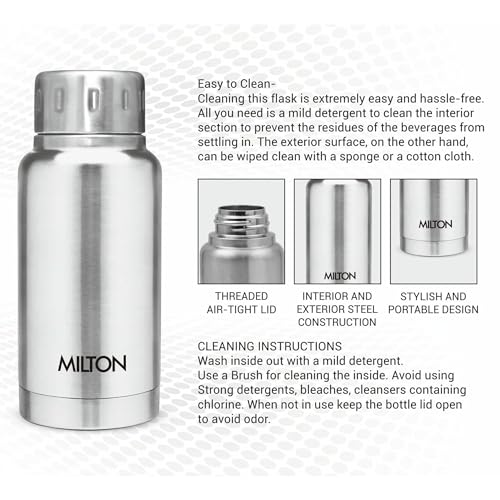 Pattern:BottleMilton Double walled vacuum insulated stainless steel water bottle keeps beverages Hot and for long hours. Inside copper coating for better heat retention. This bottle is made from high-quality steel food-grade and BPA-free stainless steel material that makes the bottles safe for use on a regular basis. The taste and nutritive value of the drinks remains intact for a long hours making the bottle very appropriate choice for storing beverages. 100% Food grade. The mouth makes it easy to drink without spilling wherever you go whether it is work travelling and gym. This double walled vacuum insulated Stainless Steel bottle is easy to carry they are highly durable and can withstand daily use with ease. You can use these bottles to store water and other beverages without the fear of breaking them. The ergonomic design of the bottles makes it easy for you to hold them while pouring out the beverage. These bottles can even be carried in the side pocket of your backpack.