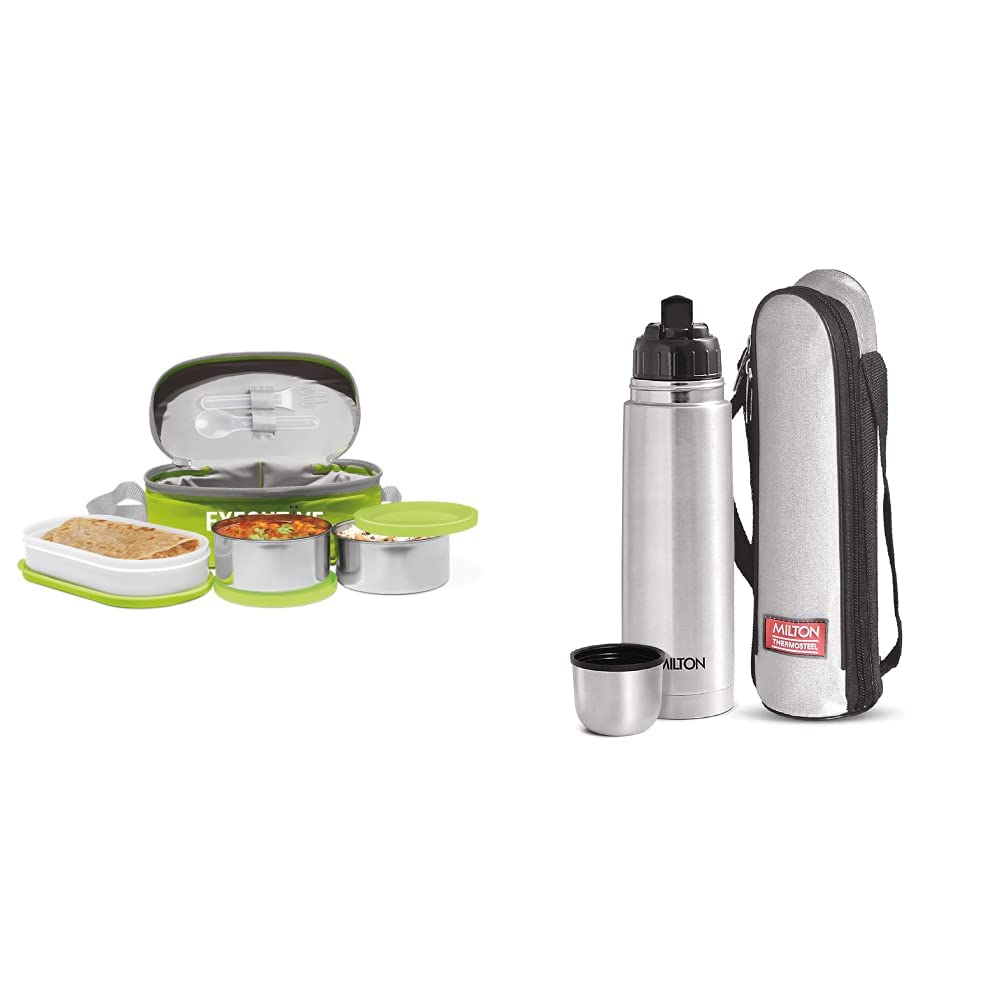 Milton Executive Lunch Box Soft Insulated Tiffin Box (2 SS Container1 Microwave Safe Container)GreenThe Milton Executive Series Lunch Box is best to cater the needs of people taking lunch to School College or Office.Milton Thermosteel Flip Lid Flask 1000 milliliters SilverKeeps beverages hot or for up to 24 hours. This contains about 1000ml capacity of beverages.