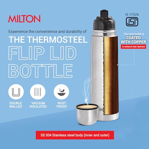 Presenting thermosteel bottles with a unique flip lid that makes pouring completely hassle-free and spill-free for you! The lid of this flask doubles up as a cup for drinking. It is vacuum insulated with inner and outer steel and is designed to keep your beverages hot or cold for 24 hours. When it comes to drinking fresh and clean water during travelling it is best way to carry water from home to avoid any contamination. The best way to remind yourself to drink water is to carry a flask with you. This bottle is made of stainless steel and it is durable user-friendly and highly functional. It not only keeps the water clean but also retains temperature for up to 24 hours. So it is not only ideal for carrying water but also for hot and cold beverages. Hence carry your favourite hot beverage for a days journey during winter and simple cold water or juice during summer to refresh yourself while travelling. A unique flip lid that makes pouring completely hassle-free and spill-free the lid of this bottle doubles up as a cup for drinking. Ideal for gifting.