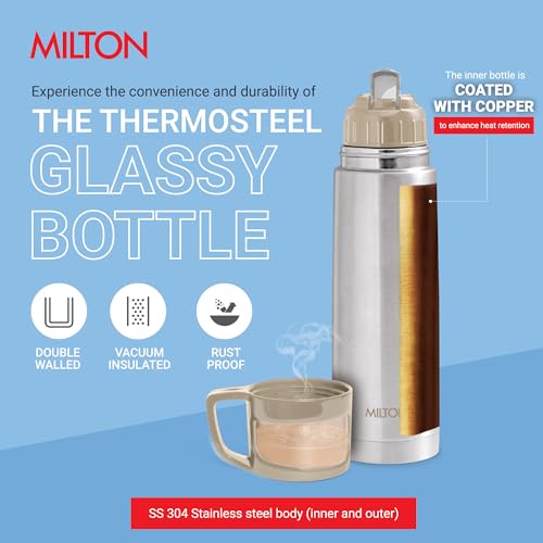 Milton Glassy 1000 Thermosteel Vacuum Insulated Double Walled Flask with Drinking Cup lid & Jacket, 1000 ml Water Bottles,24 Hours Hot & Cold,Easy to Carry,Rust Proof, Tea, Coffee,Travel Bottle,Grey