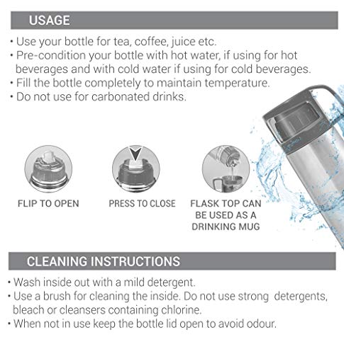 A sturdy vacuum-insulated steel flask the Thermosteel Glassy keeps your beverage hot or cold for 24 hours. It comes with a transparent plastic top lid with a handle doubles as a cup. Just press the button on the inner lid and pour beverages hassle-free. When it comes to drinking fresh and clean water during travelling it is best way to carry water from home to avoid any contamination. The best way to remind yourself to drink water is to carry a flask with you. This bottle is made of stainless steel and it is durable user-friendly and highly functional. It not only keeps the water clean but also retains temperature for up to 24 hours. So it is not only ideal for carrying water but also for hot and cold beverages. Hence carry your favourite hot beverage for a day¢¬s journey during winter and simple cold water or juice during summer to refresh yourself while travelling. Ideal for gifting.