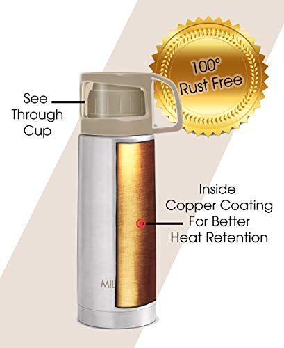 • Double walled Vacuum insulated technology keeps beverages hot or cold for 24 hours Inner copper coating for better temperature retention. It comes with a transparent plastic top lid with a handle doubles as a cup just press the button on the inner lid and