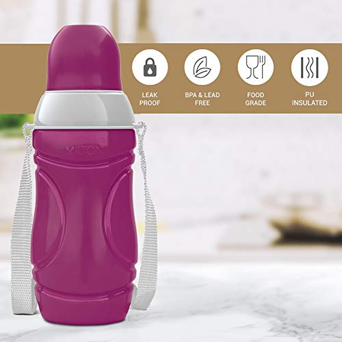 Upgrade your KDs school bottles with steel bottles. Milton has brought for your KDs pu insulated school water bottle with inner steel with high quality plastics from outside and KDs favourite prints on plastic. These bottles are made in attractive prints which KDs would love to carry everywhere. These bottles are safe to use and rust proof ss 304 grade stainless steel has been used inside. These bottles are 100 percent bpa free. The design will not fade with usage. These bottles are available in many attractive colours and designs to appeal school goers small KDs. The KDs will be really happy to have the bottle as the convenience offered with belt and straw. The bottle lid is leak proof along with hands free sipper. These bottles have been designed to be KDs friendly and safe to be used for KDs. Usage: Use your bottle for tea coffee juice etc. Pre-condition your bottle with hot water if using for hot beverages and with water if using for beverages. Fill the bottle completely to maintain the temperature. Do not use the carbonated drinks. Cleaning instructions: Easy to clean and maintain use a mild detergent or dish wash liquid and clean inside with a bottle brush. Do not use very rough cleaning sponges or bleaches as they may damage the steel exterior of the bottle by leaving scratch marks. Also keep the bottle open when not in use to avoid any odor. Caution: Kindly remove the dehydrate from the bottle. Do not eat or swallow