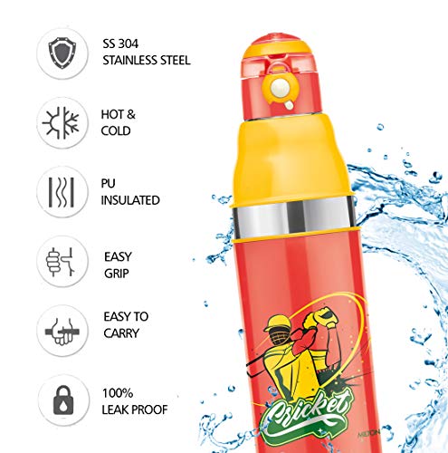 Your kid's best friend! Which is important for KDs to stay hydrated at home school and play. High levels of activity and competitive sports demand water and other beverages regularly for healthy development. Your child may need a bottle that works for both hot and liquids. This bottle is fabricated with insulation technology which keeps beverages hot or . The taste and nutritive value of the drinks remains intact for a long time making the bottle very appropriate choice for storing beverages. It has a one touch lid. It is leak proof and easy to carry anywhere. Convenient size fits in the side pocket of bags which you can carry for school Picnic car bottle holder etc.