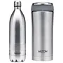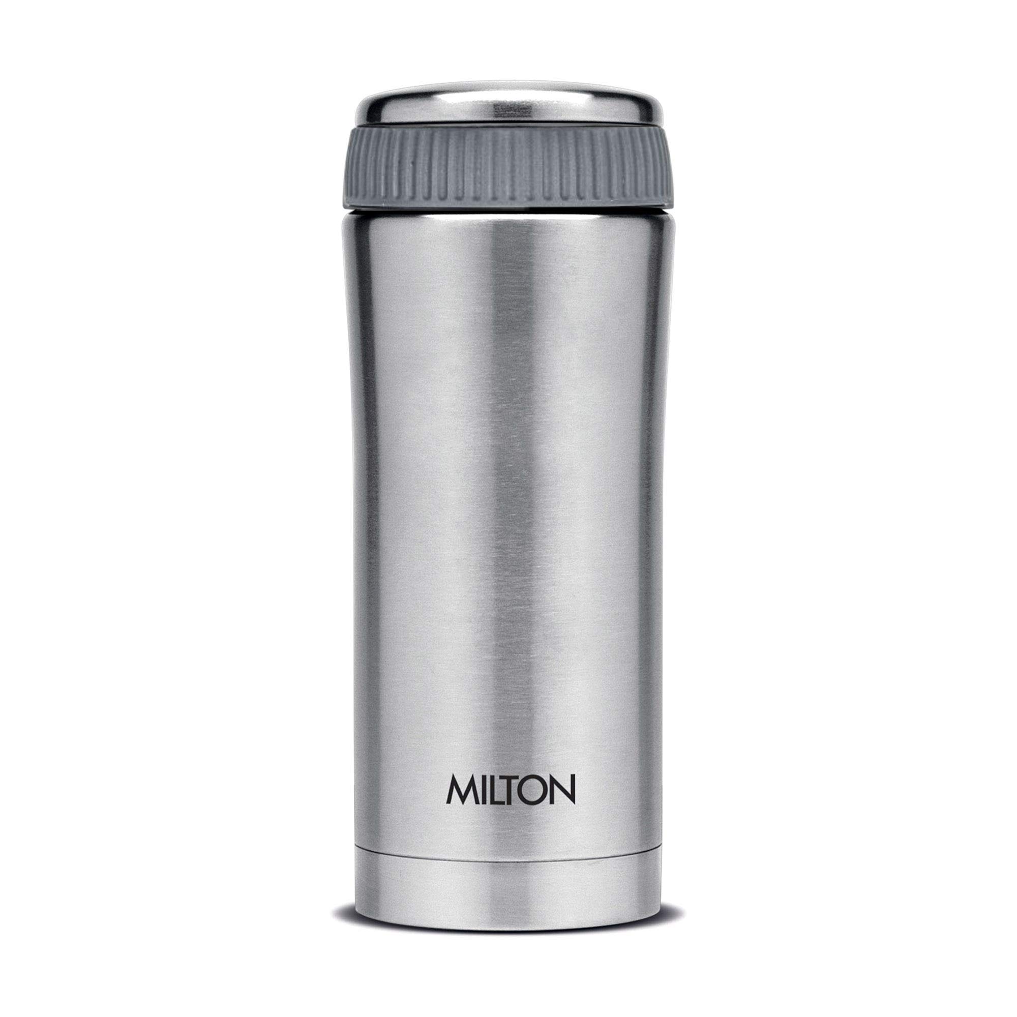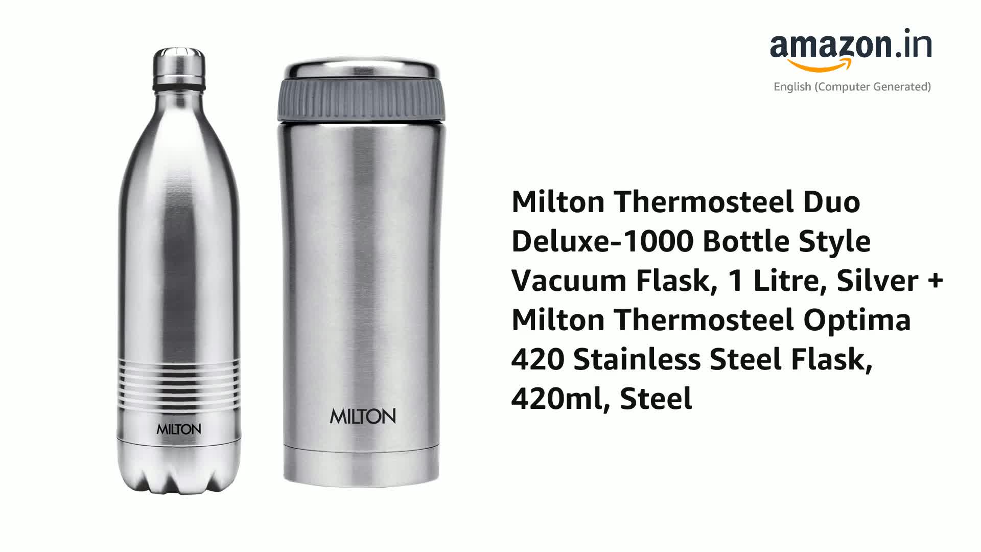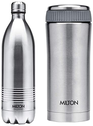 Milton Duo DLX 1000 Thermosteel 24 Hours Hot and Water Bottle 1 Litre SilverPresenting thermosteel bottles that makes pouring completely hassle-free and spill-free for you! It is vacuum insulated with inner and outer steel and is designed to keep your beverages hot or for 24 hours. When it comes to drinking fresh and clean water during travelling it is best way to carry water from home to avoid any contamination. The best way to remind yourself to drink water is to carry a flask with you. This bottle is made of stainless steel and it is durable user-friendly and highly functional. It not only keeps the water clean but also retains temperature for up to 24 hours. So it is not only ideal for carrying water but also for hot and beverages. Hence carry your favourite hot beverage for a days journey during winter and simple water or juice during summer to refresh yourself while travelling. A unique flip lid that makes pouring completely hassle-free and spill-free the lid of this bottle doubles up as a cup for drinking. Ideal for gifting.Milton Optima 420 Thermosteel Hot and Flask 420 ml SilverIdeal beverage carrying solution whether you prefer having your own coffee or tea at office or like to have a fresh cup of buttermilk or your favourite fruit juice the Milton Optima Thermosteel flask is the perfect solution for your beverage consumption needs. Its compact size makes it an easy fit in most office bags and backpacks adding to its portability feature. Use this flask to carry tea coffee fruit juices lassi and other beverages wherever you go. Unique design with temperature retention a rich steel finish on the outside the Milton Thermosteel Optima flask helps make a style statement wherever you carry it along. The insulation ensures that your beverages stay hot or for hours for a perfect consumption experience. Furthermore it features a separate compartment for carrying Sugr mediciine or tea bags on the go. Easy to use clean and maintain using this Milton Thermosteel Optima flask is an easy task as you simply have to fill it up with your favourite beverage preferably to the brim to maintain temperature for a long time. It is easy to clean as you simply need to use a mild soap solution and avoid strong detergents to keep it looking new for a long time. To avoid odours developing over time keep the flask lid open when not in use.