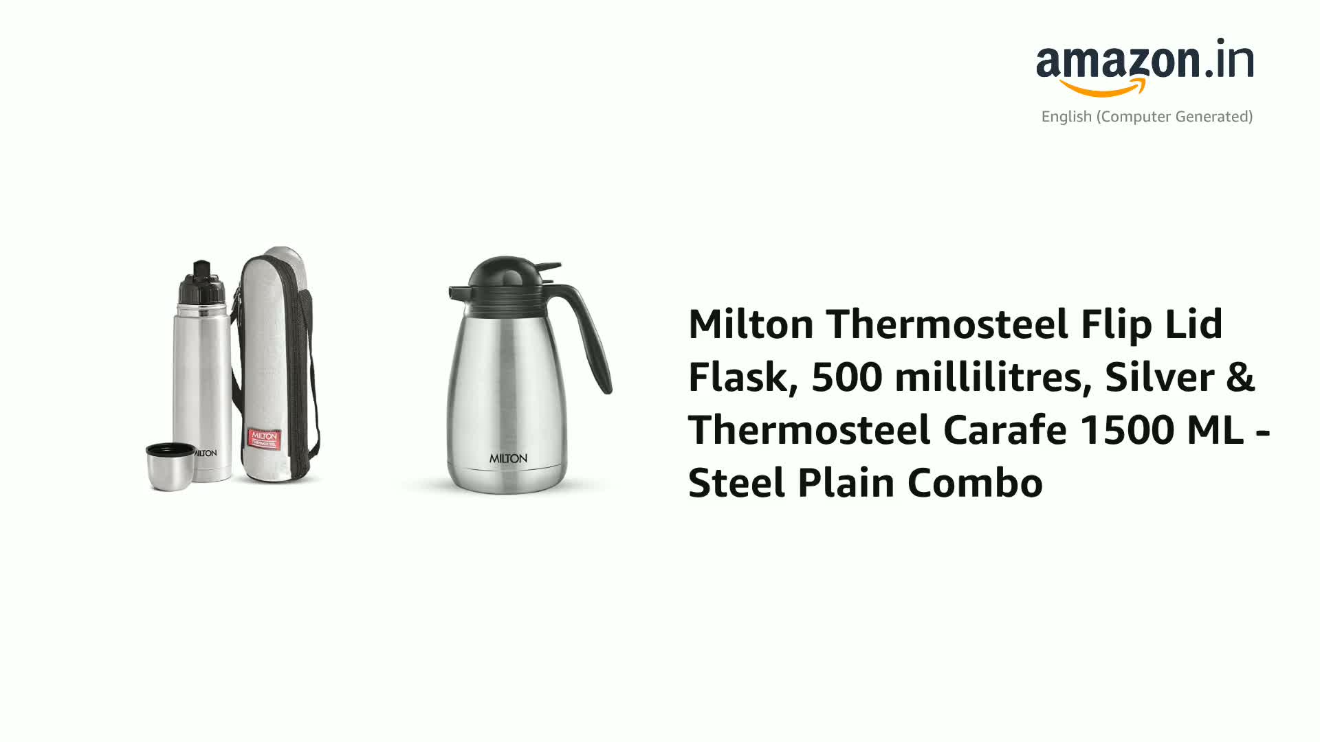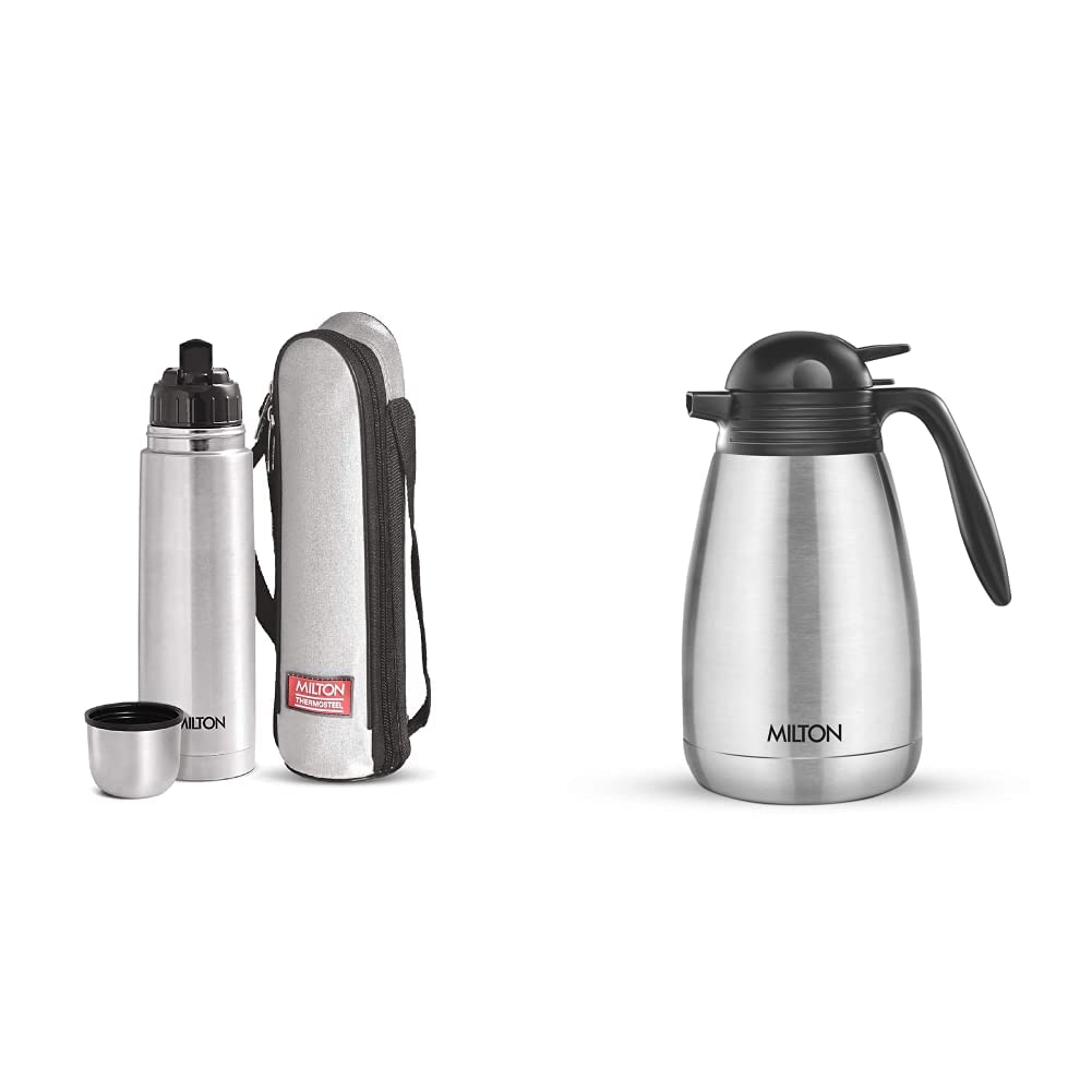 Milton Thermosteel Flip Lid Flask 500 milliliters Silverp>Store hot or beverages with ease and maintain their temperature and flavours for hours with the Milton Thermosteel flip lid flask. This sturdy steel flask with a capacity of 500 ml keeps liquids hot or for 24 hours. It is fabricated inside out with 18/8 quality stainless steel that is rust proof. This vacuum-insulated flask features a unique flip lid that provides a spill-free pouring action. Its lid also serves as a cup that can be used to drink. This versatile flask is easy to clean and perfectly suits your needs for hot and beverages. Milton is a trusted name in the food and beverage storage segment. The wide range of Milton products comprise of household items that are high on function and style. This Thermosteel flip lid flask from Milton is a classic example of a great product that serves a number of functions while being a stylish addition to your lunch box or picnic basket. It is ideal for transporting your favourite beverage from place to place courtesy its insulated interior. A Flask that Meets Your Requirements : The Thermosteel Flip Lid Flask is a great choice for people who are always on the move and have a knack for drinking tea or coffee. You can fill it with tea coffee juice or hot chocolate and sip on while sitting in a park or reading in the library. The Milton Thermosteel Flask is especially useful if you have Infents at home and need to have hot water handy at all times. With this flask you can avoid re-heating water repeatedly and thus save gass effort and your precious time. Keeps Your Coffee Hot and Juices : Sporting a stainless steel interior this bottle maintains the temperature of liquids for up to 24 hours. The bottle comes with a matte finish exterior which maintains the external temperature of the flask regardless of temperature of the liquid inside it.Milton Thermosteel Carafe 1500 ML - Steel PlainThe Milton Carafe is a vacuum insulated flask with inner and outer steel. It is designed to keep your beverages hot or for long hours. It has a functional lid that makes pouring completely hassle free for you. Ideal for serving tea and coffee.
