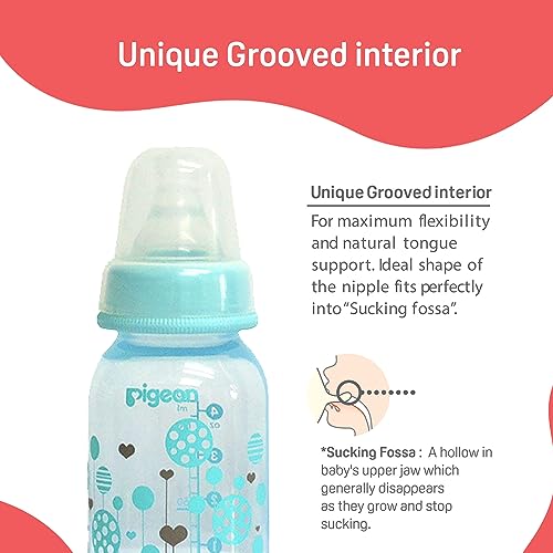 Pigeon peristaltic nipple plastic feeding bottle is a healthy start to a baby's independent eating habits.The bottle allows natural movement of the baby's tongue ensuring maximum development of baby's facial and jaw muscles.The nipple of the bottle is stretchable and allows easy sucking and wide movement of the baby's tongue.
