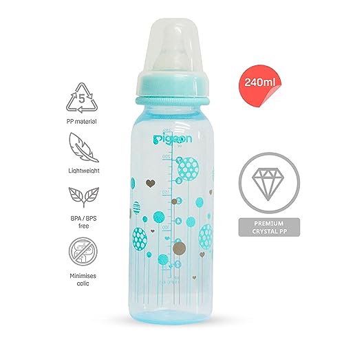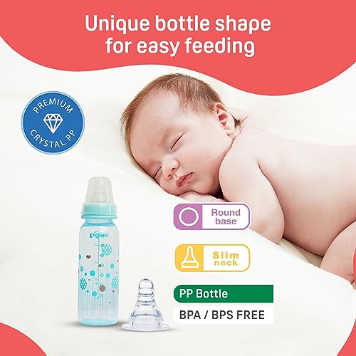Pigeon peristaltic nipple plastic feeding bottle is a healthy start to a baby's independent eating habits.The bottle allows natural movement of the baby's tongue ensuring maximum development of baby's facial and jaw muscles.The nipple of the bottle is stretchable and allows easy sucking and wide movement of the baby's tongue.