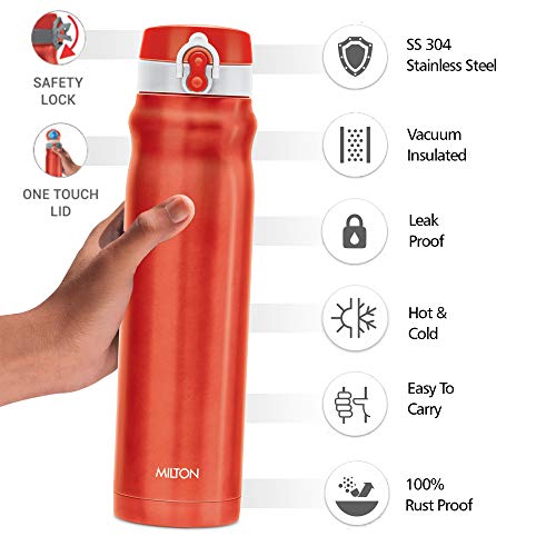 Milton Double walled vacuum insulated stainless steel water bottle keeps beverages hot and cold for hours. This bottle is made from high-quality steel food-grade and BPA-free stainless steel material that makes the bottles safe for use on a regular basis. The taste and nutritive value of the drinks remains intact. Making the bottle very appropriate choice for storing beverages. 100% Food grade. The mouth makes it easy to drink without spilling wherever you go whether it is work travelling and gym. This double walled vacuum insulated Stainless Steel bottle is easy to carry they are highly durable and can withstand daily use with ease. You can use these bottles to store water and other beverages without the fear of breaking them. The ergonomic design of the bottles makes it easy for you to hold them while pouring out the beverage. These bottles can even be carried in the side pocket of your backpack.