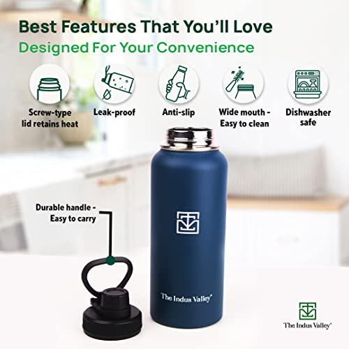The Indus Valley Pro-hydro Vacuum Insulated Stainless Steel Wide Mouth Bottle for School/College/Office with Handle | Blue 1000 ml | 304 Grade SS Double Walled Hot & Cold Temperature Leak Proof BPA-free