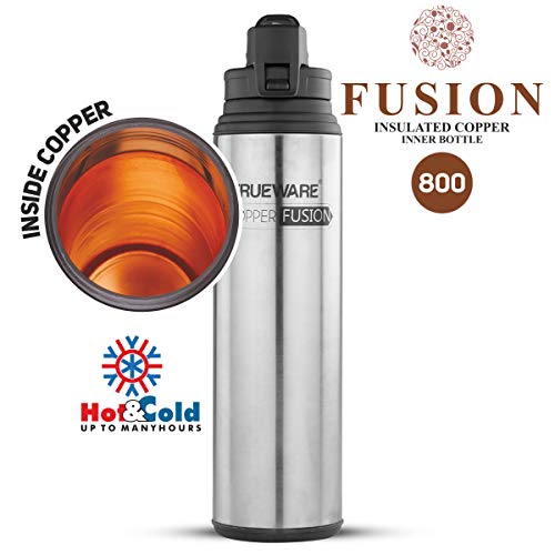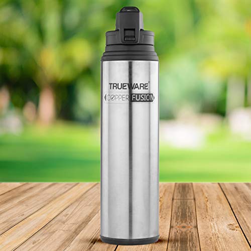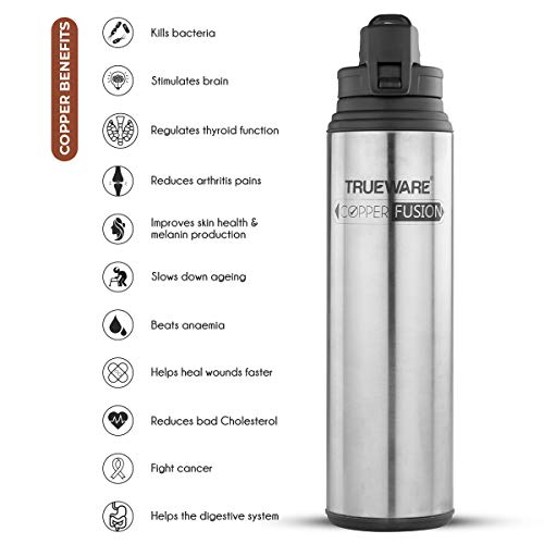 Trueware Copper Fusion Insulated bottle is designed to keep water for long hours. It is Double wall polyurethane insulated copper body inside and outside Stainless steel make it an elegant bottle. Storing water in a copper vessel creates a natural purification process. It can kill all the micro-organisms moulds fungi algae and bacteria present in the water that could be harmful to the body. Helps the digestive system perform better. Aids weight loss. Helps heal wounds faster. Slows down ageing. Helps maintain heart health and beats hypertension. Mitigates the risk of cancer. Protects you from infections. Regulates the working of the thyroid gland. Beats arthritis and inflamed joints. Boosts skin health and melanin production. Beats anemia. Hygenic flip- top lid which is convenient to use with single hand. All over sealed body no point of any leakage or dripping while travelling or so.It has inner insulated copper body which makes it unbreakable. BPA free & FDA Approved plastic used.