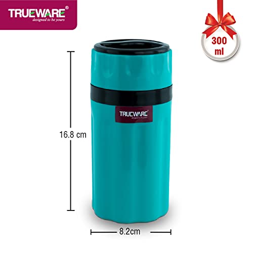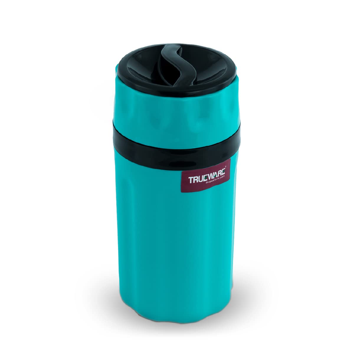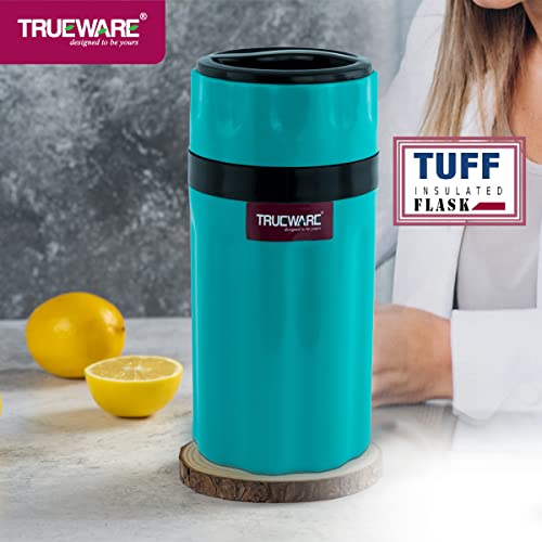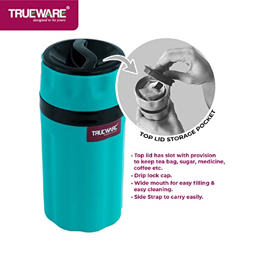 Trueware Tuff Flask Double-wall polyurethane Insulated handy flask is designed to keep yours beverages hot/cold for long hours. Its stainless steel body on the inside and high grade plastic body outside (bpa free and fda certified) which makes it a highly utility and a spill proof flask. It has twisted top lid for storage compartment to keep tea bags sugar in cubes/ crystal form coffee medicines protein powder etc. Wide mouth to fill and clean easily. It is easy to carry with a strap. This Flask is perfect for on the go daily usage on buses trains etc and for gifting as well.