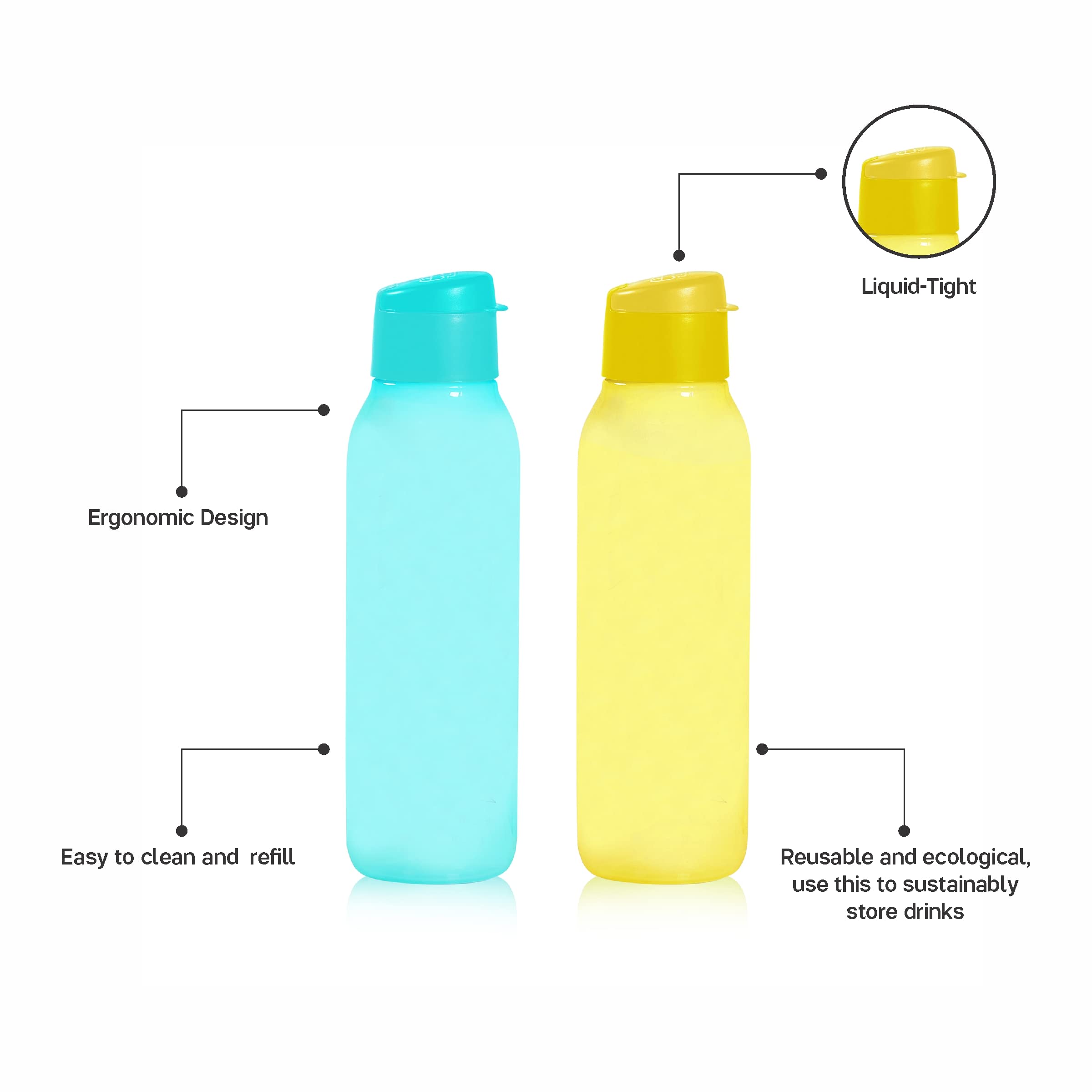 What time of the day do you usually realize that you havenât had enough water throughout the day? Instead of making multiple trips to the office water dispenser or buying dubious bottled water from roadside vendors stay hydrated with Tupperwareâs Cool and Chic Eco Water Bottle. This leak-proof water bottle allows you to carry water wherever you go and helps you do your bit for the environment by avoiding disposable plastic water bottles. Add a creatively inspiring and fun touch to your day with this vibrant and trendy sustainable water bottle!