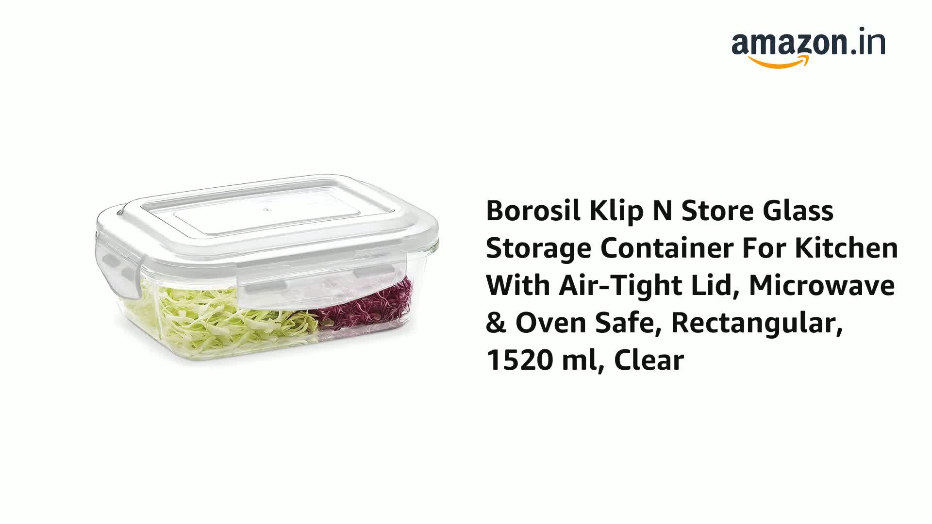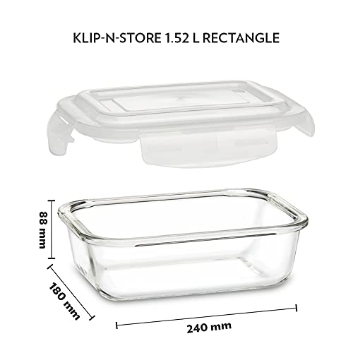 Borosil Klip N Store Glass Storage Container For Kitchen With Air-Tight Lid, Microwave & Oven Safe, Rectangular, 1520 ml, Clear