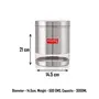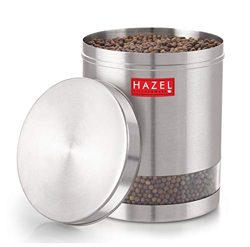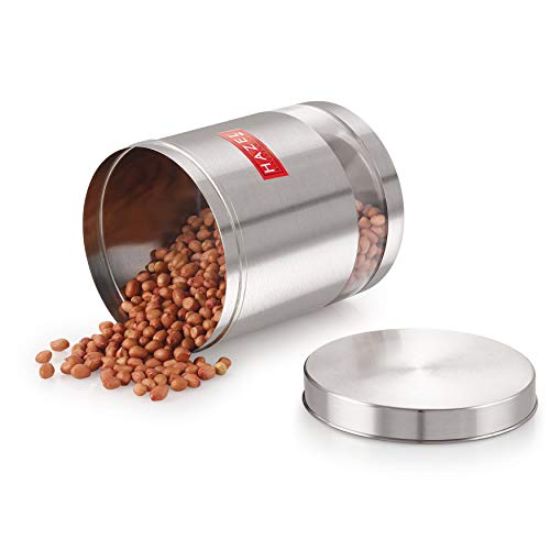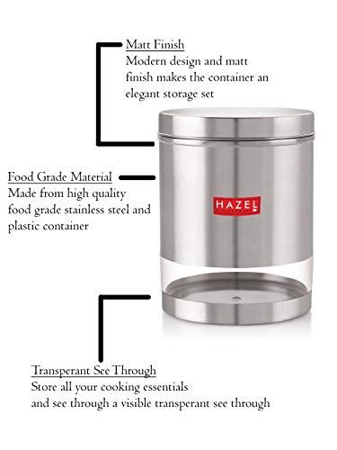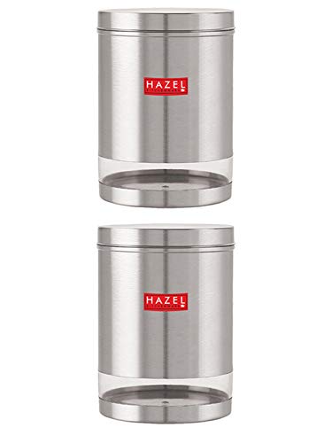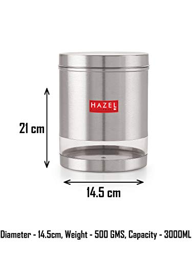 HAZEL Stainless Steel Containers Set For Kitchen Storage Transparent See Through Matt Finish Storage Jars Dabba Set of 2 3000 ML Each Silver Containers have a see through body looks like elegant and It is ideal for keeping a track of your food products. If you are looking for high quality & durable stainless steel storage Containers for storing Then we are offers you high standard stainless steel storage container which is perfect to meet your storing need. This highly durable stainless steel storage containers with stainless steel lid. Perfect for gifting purposes at weddings anniversaries. all your cooking essentials and see the contents of the jar through a visible transparent see through window and check supply levels of food inside containers. Made from high quality food grade stainless steel container which ensures strength quality and durability.The modern design see through canister container is perfect for your beautiful home and kitchen.Ideal for multipurpose storing Tea Sugar Coffee powder Spices Dryfruits Biscuits Candies Namkeen & Cooking Essentials.Wash Care Instructions:- Wash with lukewarm water Do not scrub with scrubber Not for hot filling. Avoid the use of abrasive scrubbers.Container Dimension : 14.5 x 14.5 x 21 cm (LxBxH) Diameter : 14.5 cm Weight : 500 gm Capacity : 3000 ML. 3 Month Manufacturer Warranty. This product is under 3 Months Warranty from the date of retail purchase against any manufacturing defects in material and workmanship. The Warranty does not cover damages resulting from accidents mishandling or tampering with the mechanism. Warranty valid against producing original bill endorsed by the seller.